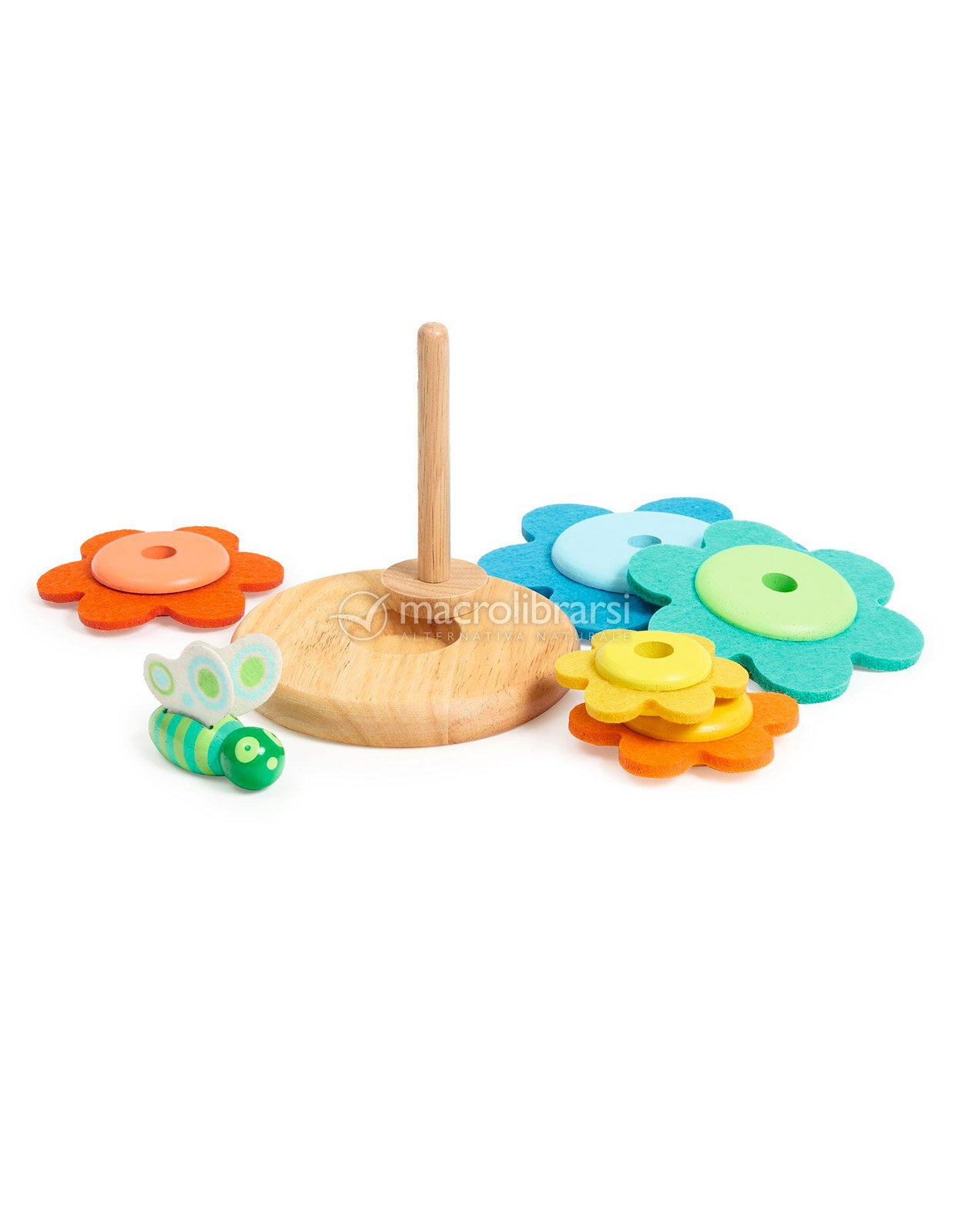 Sull'asta che oscilla si impilano sei anelli in legno e feltro a forma di fiore: un'attività apparentemente semplice ma ricca di stimoli tattili e visivi, che favorisce la coordinazione occhio-mano, la precisione dei movimenti e il piacere della scoperta.
