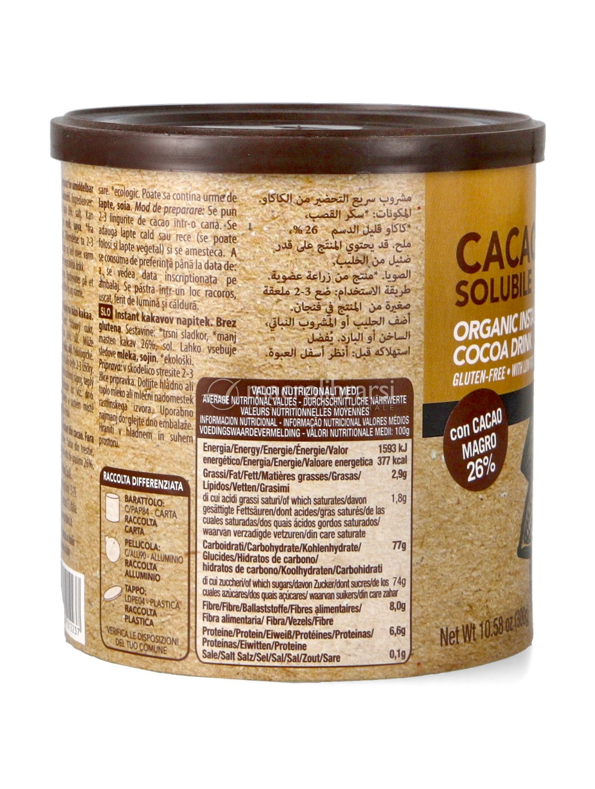 Questo è un buon cacao solubile bio. Ho apprezzato la comoda e pratica confezione in barattolo. Ho sbagliato a comprarlo però perché avevo bisogno di un preparato per la cioccolata calda. L’ho usato comunque aggiungendo dell’amido di tapioca per farlo addensare. L’unica pecca è che lo avrei preferito meno zuccherato, io ho dovuto aggiungere del cacao amaro per renderlo meno dolce.