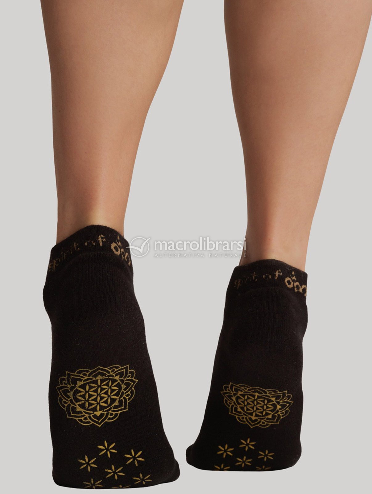La lunghezza alla caviglia unisce protezione e libertà di movimento. La suola antiscivolo, decorata con un mandala e foglie del Fiore della Vita, garantisce un appoggio sicuro e un'estetica raffinata, trasformando ogni posizione in un gesto di equilibrio e bellezza.