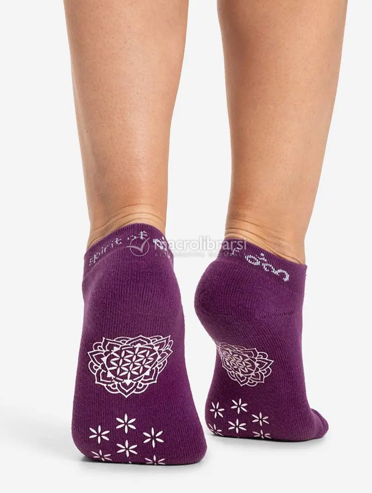 Con la loro lunghezza alla caviglia, uniscono protezione e libertà di movimento. La suola antiscivolo, impreziosita da un elegante mandala e da foglie simboliche del Fiore della Vita, offre un appoggio sicuro e un’estetica raffinata, trasformando ogni posizione in un gesto di equilibrio e bellezza.
