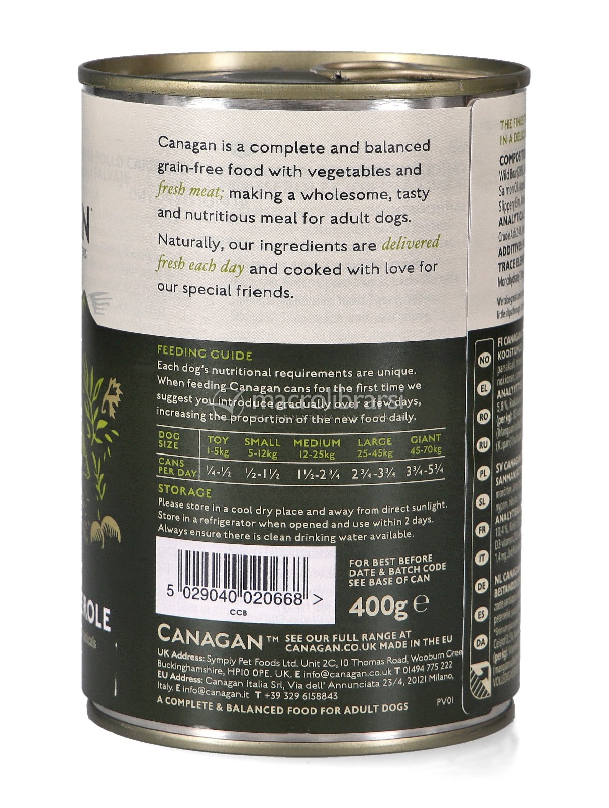 Il formato da 400 g è ideale sia come pasto completo bilanciato che come "topping" goloso per arricchire le crocchette Canagan.