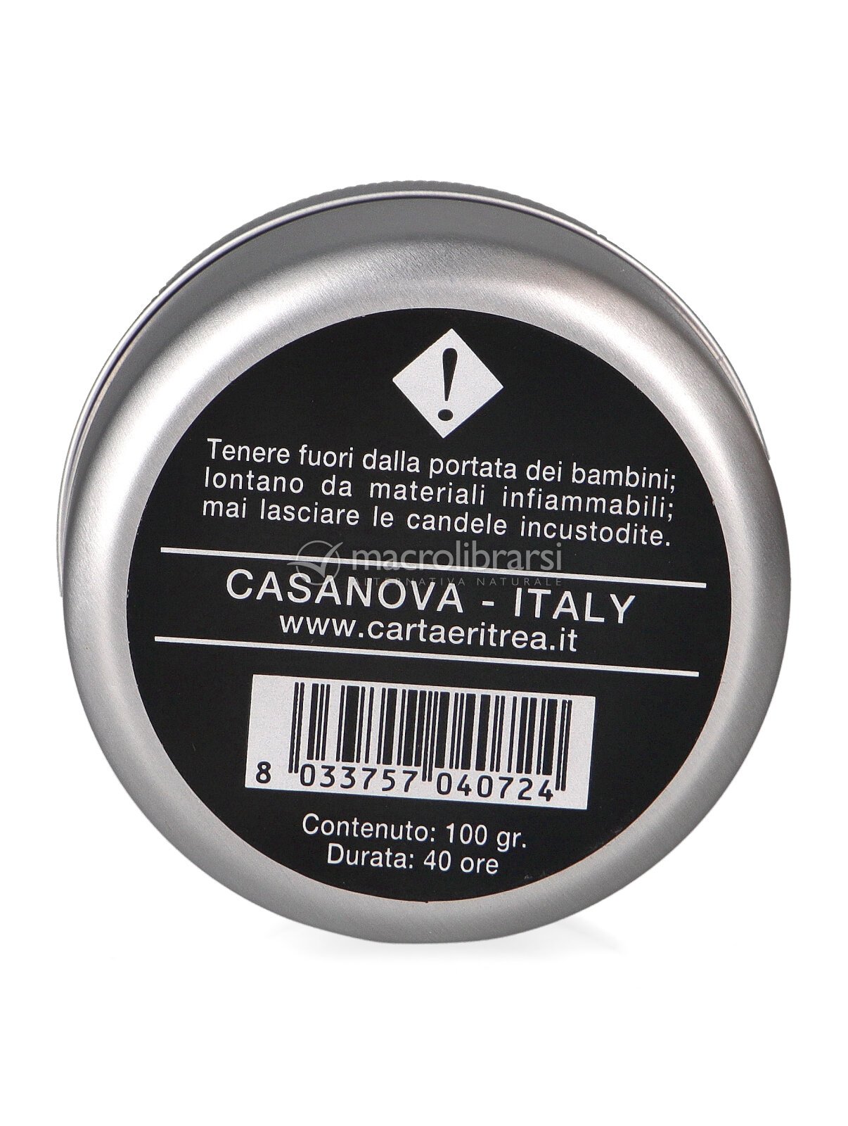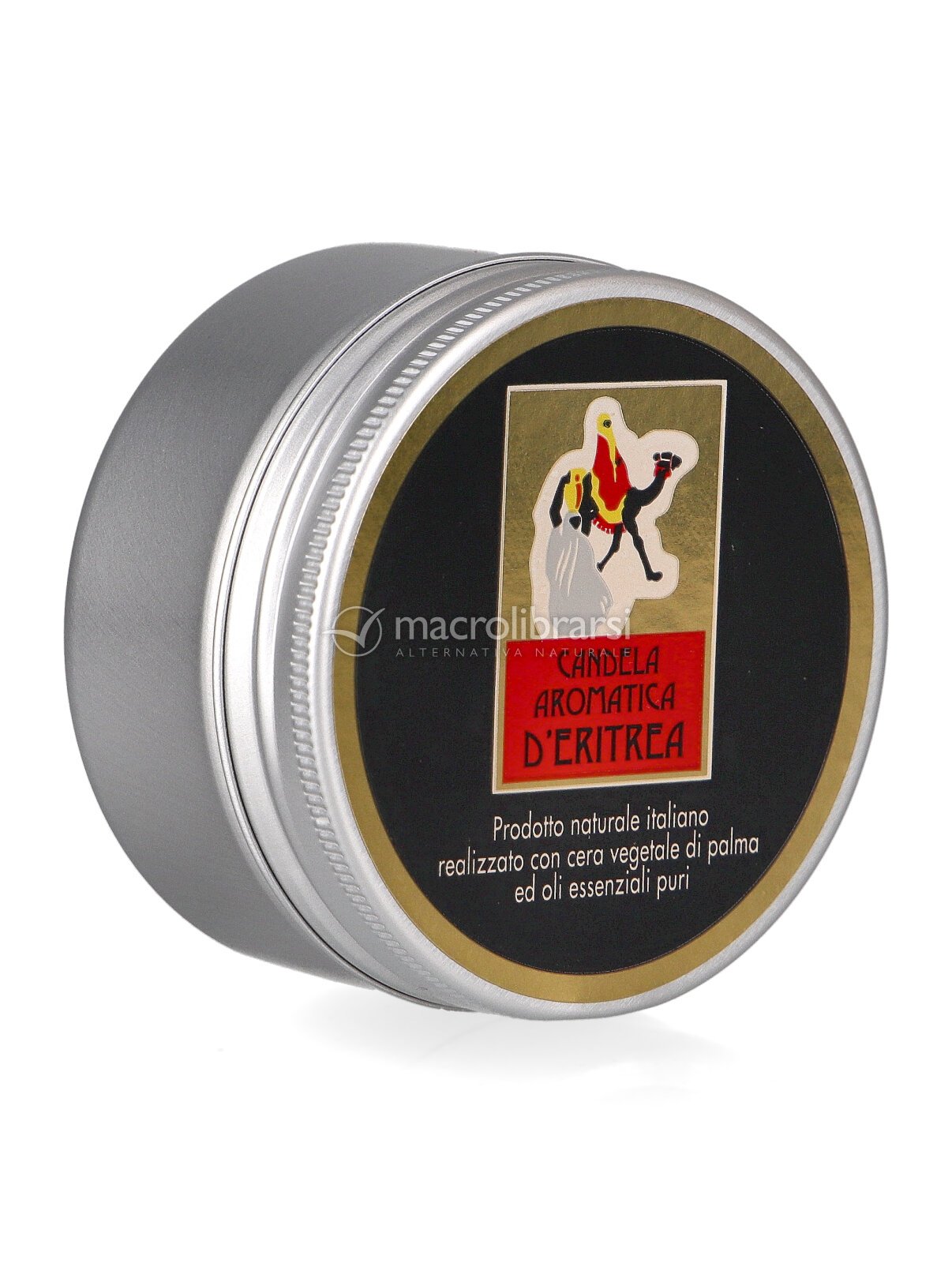 Un grazioso barattolino di alluminio con coperchio avvitabile fregiato dall'inconfondibile ed elegante marchio nei colori oro, rosso, bianco e nero della Carta Aromatica d'Eritrea racchiude in modo protetto ed originale cento grammi di preziosa candela. Gli ingredienti sono ecologici e naturali, di origine eslusivamente vegetale: cera di palma con il dieci per cento di oli essenziali purissimi. Svitare il contenitore ed accendere lo stoppino vi regalerà quaranta indimenticabili ore di inebriante profumazione e sanificazione degli ambienti domestici e lavorativi. Da tempi immemorabili, sia in Eritrea sia in Somalia, alcune pregiate essenze naturali, muschi e particolari resine odorose vengono abitudinariamente utilizzate per purificare l'aria tramite diffusione di gradevoli e persistenti note profumate dalle qualità antisettiche. Questo prodotto, venduto nelle migliori erboristerie di tutta Europa, permette di diffondere facilmente ed immediatamente meravigliose, salubri e delicate sinfonie olfattive.
