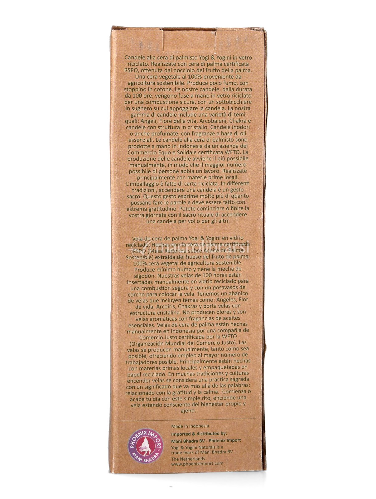 Realizzato con cera di palma certificata RSPO, dal nocciolo del frutto della palma. Una cera vegetale al 100% da agricoltura sostenibile. Poco fumo, con stoppino in cotone. Realizzato a mano in Indonesia da una società Fairtrade certificata WFTO, fornendo lavoro per il maggior numero possibile di persone. Circa l'ottanta per cento dei dipendenti è composto da donne. L'imballaggio è realizzato con carta riciclata. Una candela genuina e colorata, con un occhio di riguardo per il benessere del nostro pianeta e dei suoi abitanti.