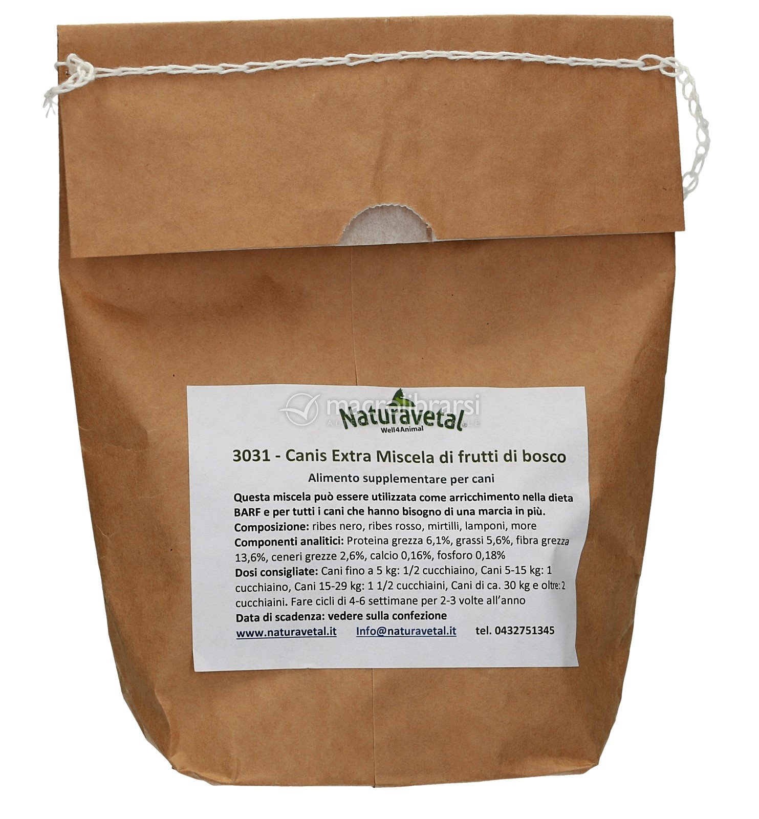 La polvere di frutti di bosco Canis Extra è una potente miscela di frutti preziosi che forniscono flavonoidi, vitamine, antiossidanti, minerali e altri ingredienti sani.