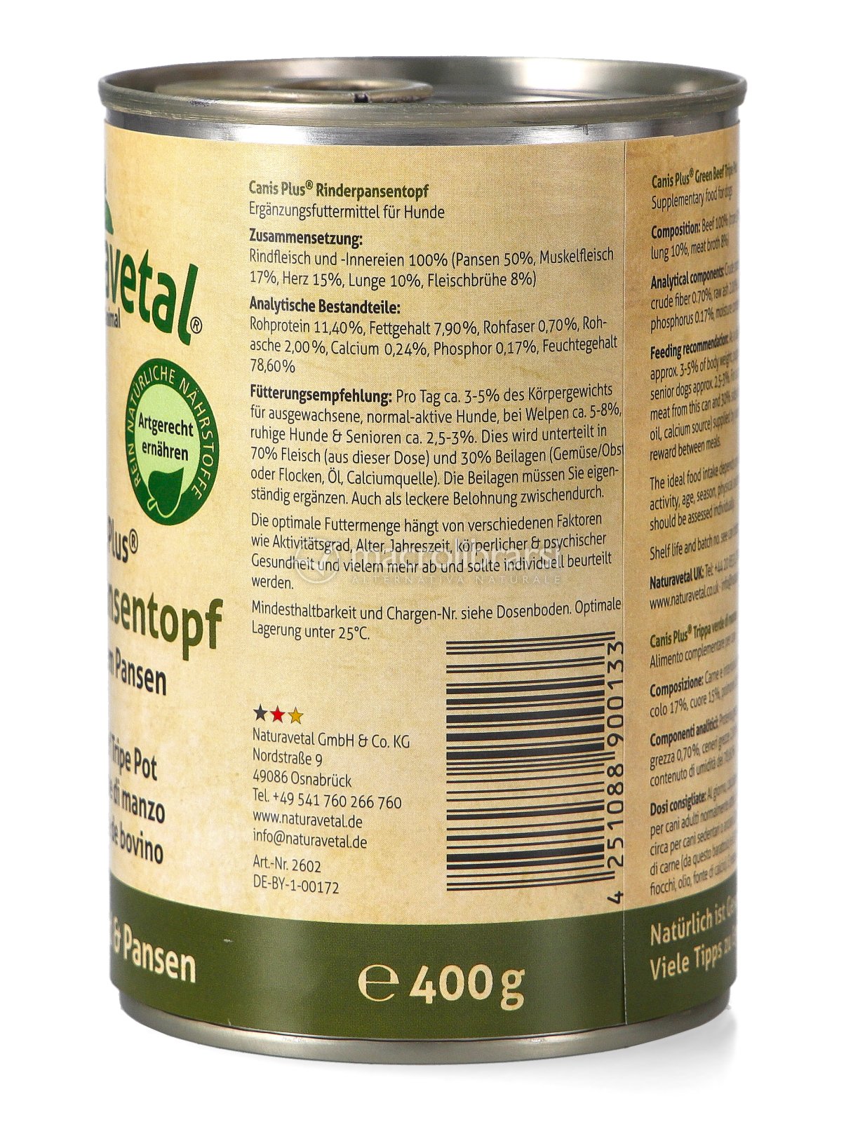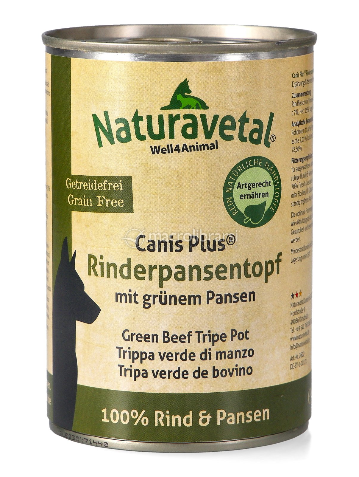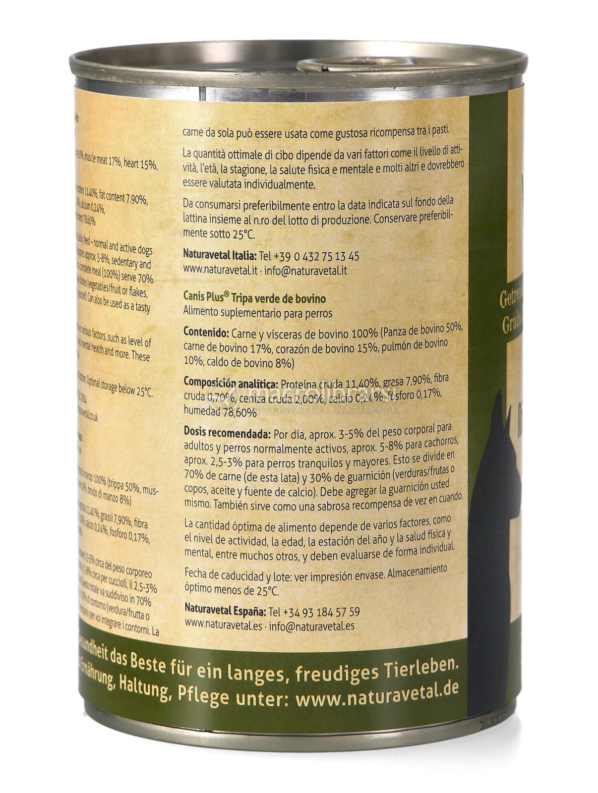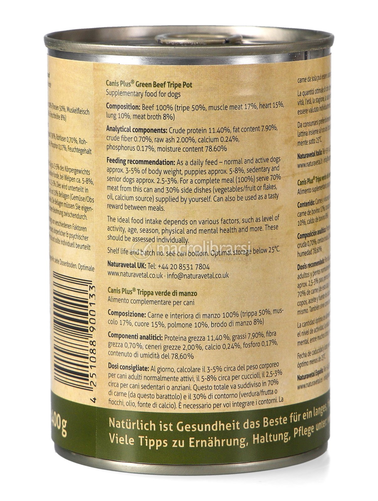 La trippa di manzo supporta la flora intestinale attraverso la fermentazione e l'alto contenuto di vitamine. La lattina contiene carne di altissima qualità e di prima scelta.