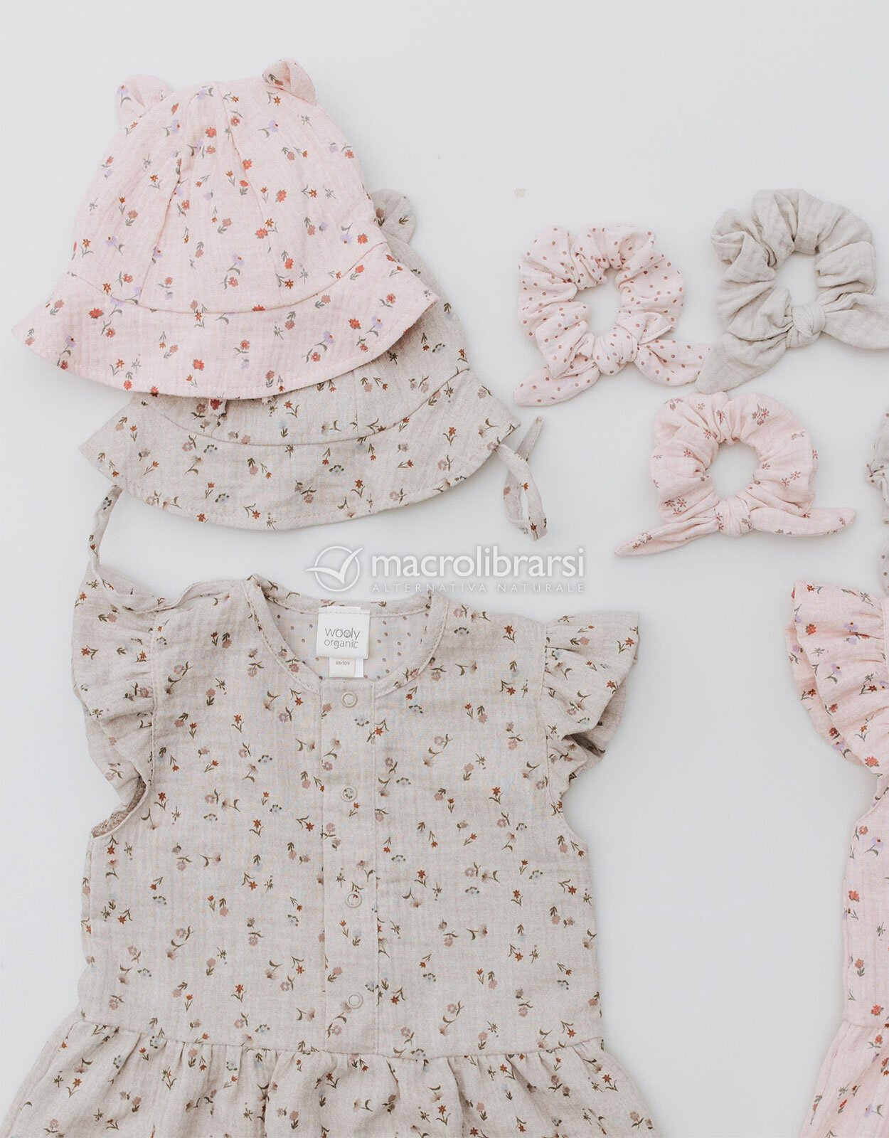 Cappellino da sole in mussola di cotone organico con orecchie da orso, adatto a bimbe con circonferenza cranica di 50/52 cm.