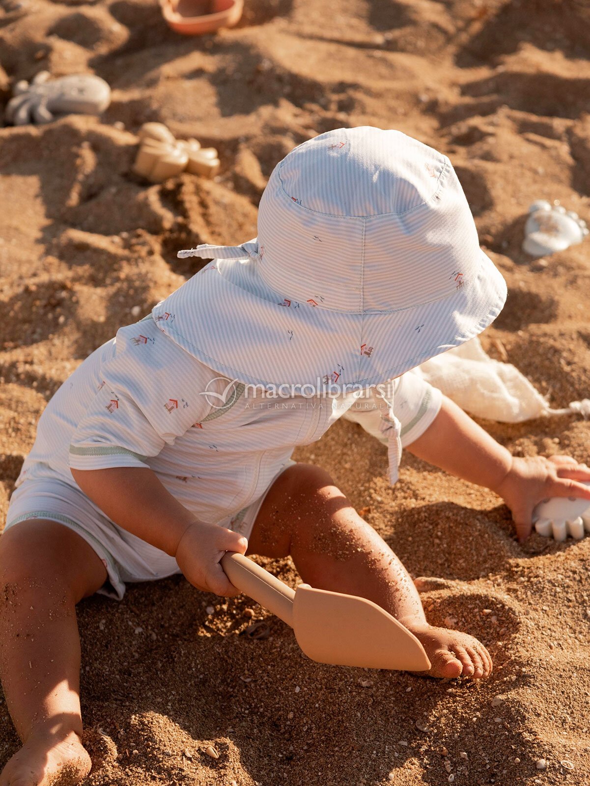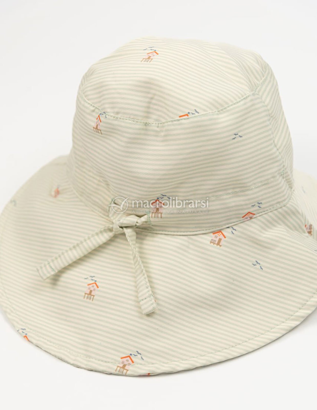 Cappellino da sole con protezione solare SPF 50+, realizzato in poliestere riciclato, ideale per proteggere i bambini durante le loro esplorazioni estive.