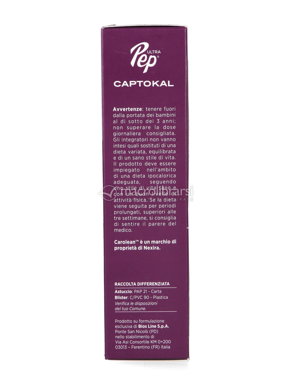 | Disclaimer | Non superare la dose giornaliera consigliata. Gli integratori alimentari non vanno intesi come sostituti di una dieta variata ed equilibrata. Tenere fuori dalla portata dei bambini al di sotto dei tre anni. Non utilizzare in gravidanza e nei bambini o comunque per periodi prolungati senza sentire il parere del medico. Conservare in luogo asciutto e lontano da fonti di calore. Richiudere la confezione dopo l'uso. Macrolibrarsi ricorda l'importanza di seguire uno stile di vita sano e un'alimentazione variata ed equilibrata. |