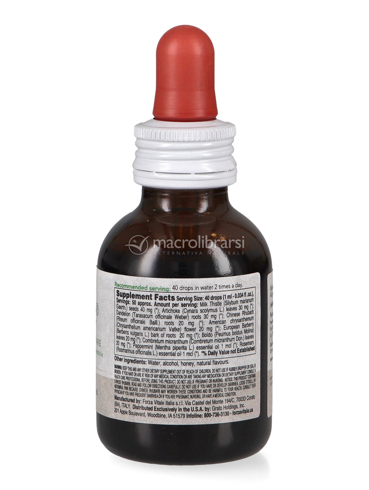 Acqua, alcool, Cardo mariano (Silybum marianum L.) semi, Carciofo (Cynara scolymus L.) foglie, Tarassaco (Taraxacum officinale Weber) radice, Rabarbaro (Rheum officinale Baill.) rizoma, Crisantemo americano (Chrysanthellum americanum Vatke) fiori, Crespino (Berberis vulgaris L.) corteccia, Boldo (Peumus boldus Molina) foglie, Combreto (Combretum micranthum Don.) foglie, miele, Menta (Mentha piperita L.) o.e., Rosmarino (Rosmarinus officinalis L.) o.e., miscela di aromi naturali.
