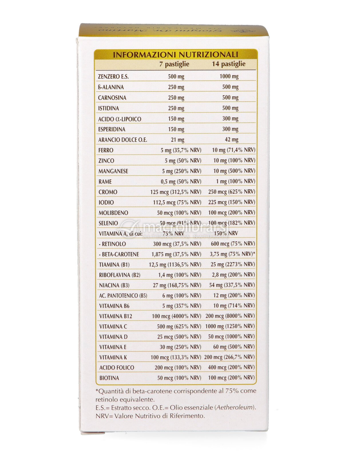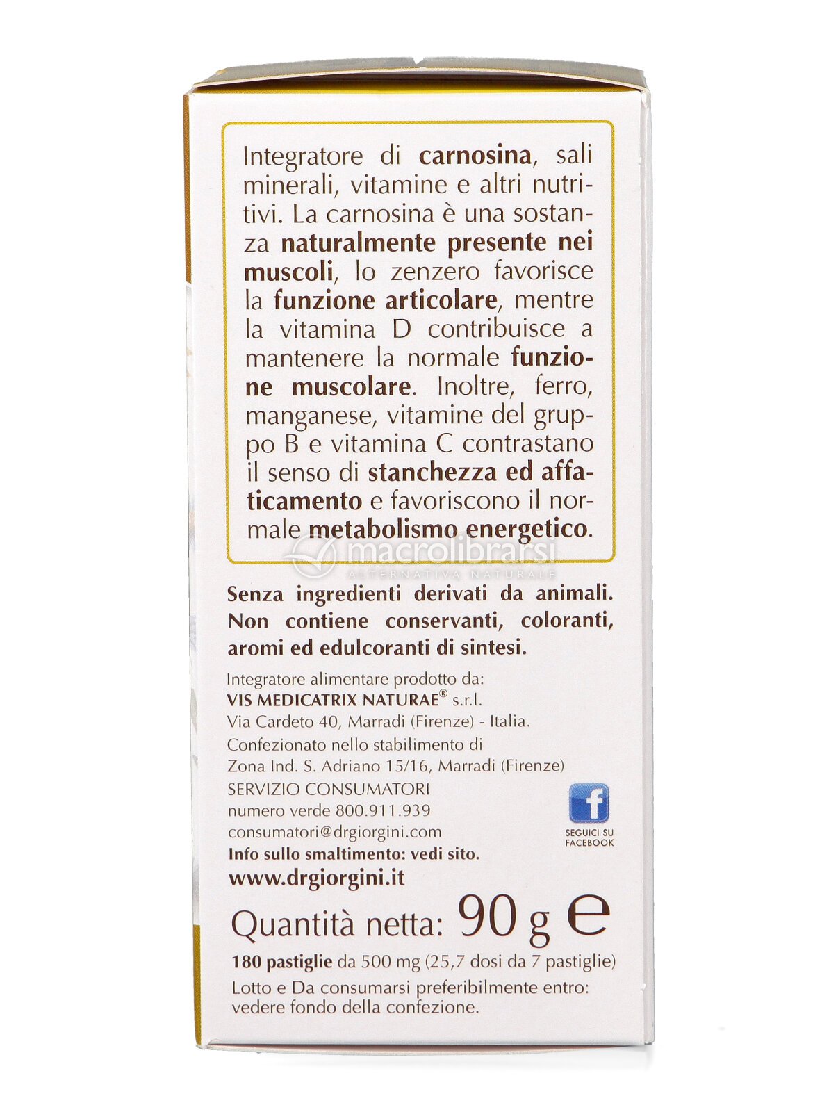 Carnosina plus di Giorgini Dr. Martino è un integratore alimentare in pastiglie, senza coloranti, conservanti, aromi ed edulcoranti di sintesi. Contiene Carnosina, assieme a sali minerali, vitamine e altri nutritivi utili per il recupero energetico post-esercizio.