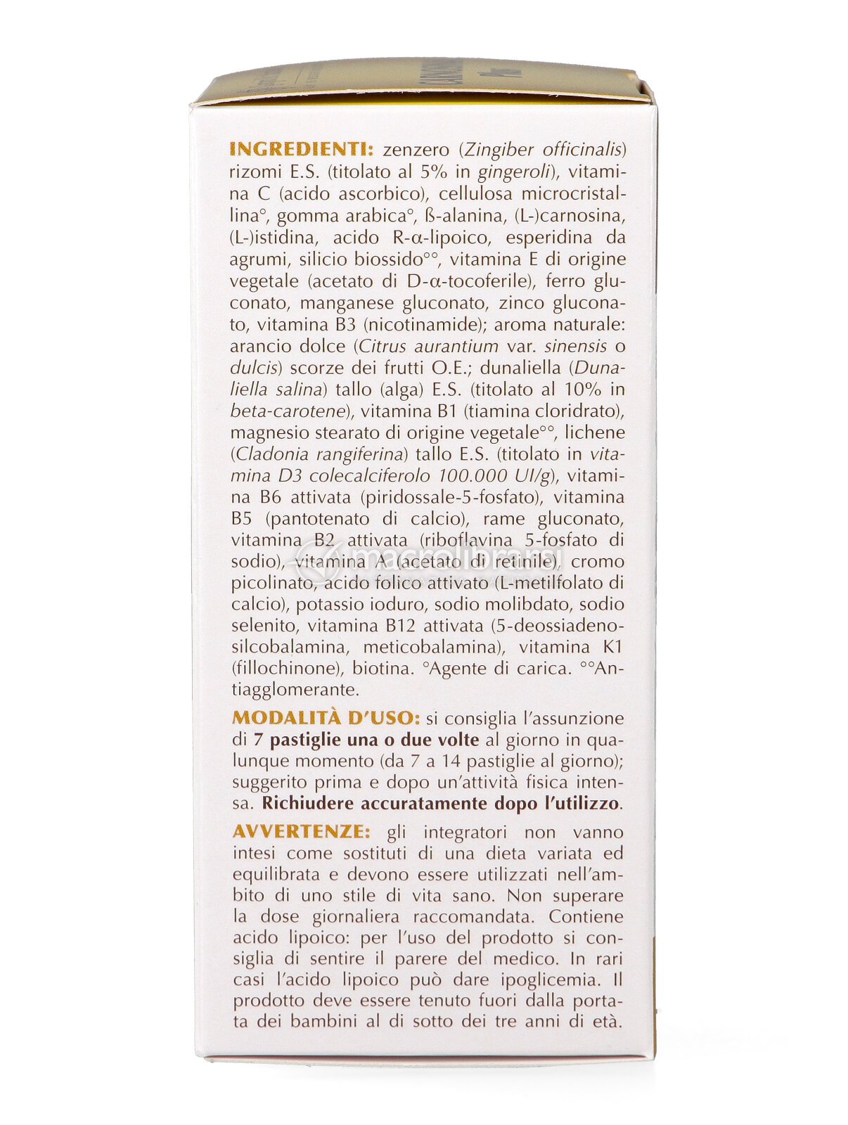 | Avvertenze | Gli integratori non vanno intesi come sostituti di una dieta variata ed equilibrata e devono essere utilizzati nell’ambito di uno stile di vita sano. Non superare la dose giornaliera raccomandata. Contiene acido lipoico: per l’uso del prodotto si consiglia di sentire il parere del medico. In rari casi l’acido lipoico può dare ipoglicemia. Il prodotto deve essere tenuto fuori dalla portata dei bambini al di sotto dei tre anni di età. |