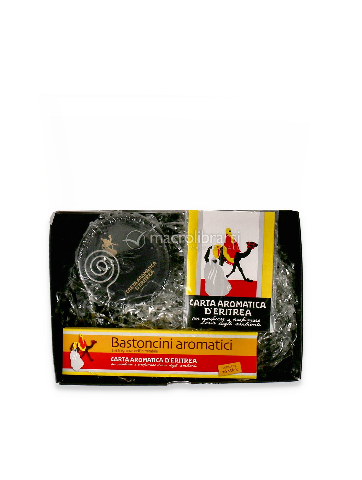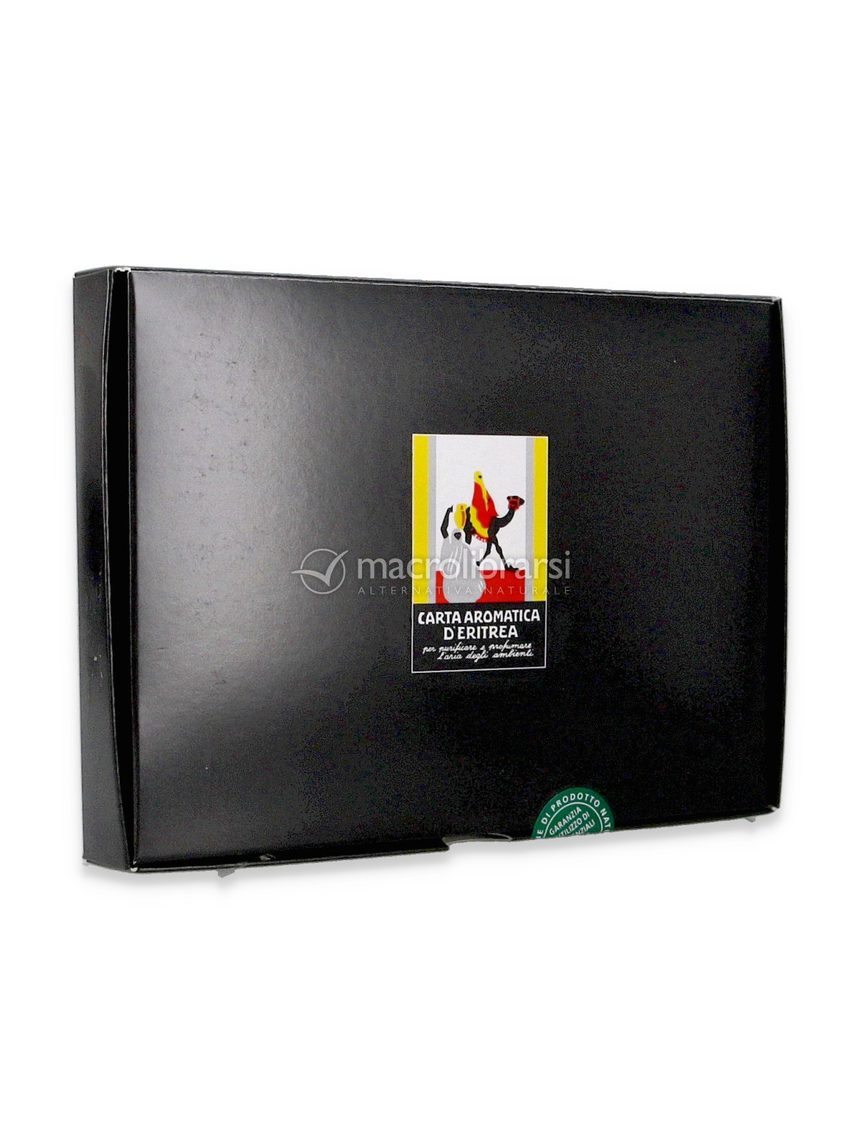| Confezione | 1 libretto di Carta d’Eritrea 24 listelli + 1 scatola di 16 Bastoncini Profumati (incensi) ed un piattino bruciatore |