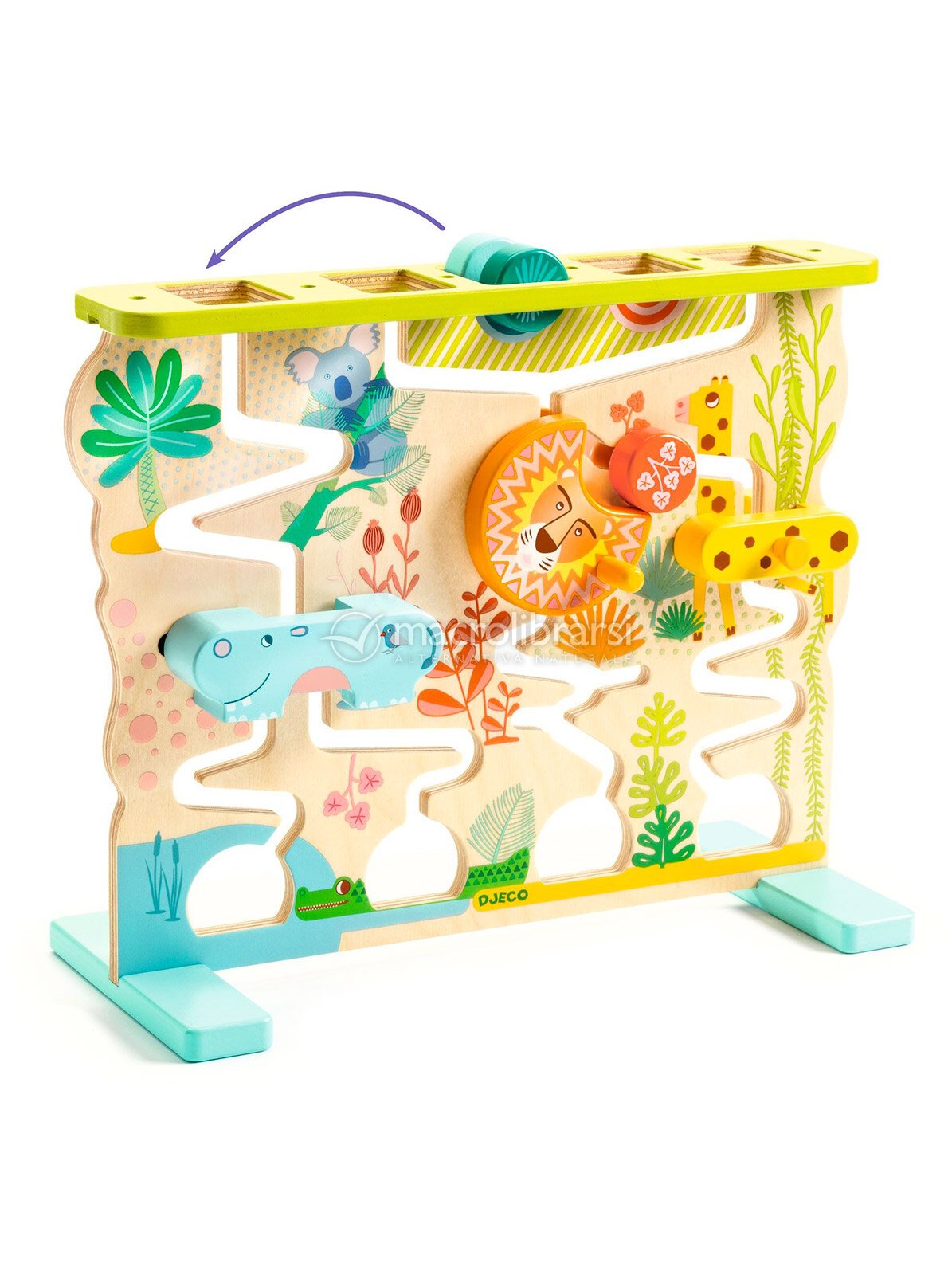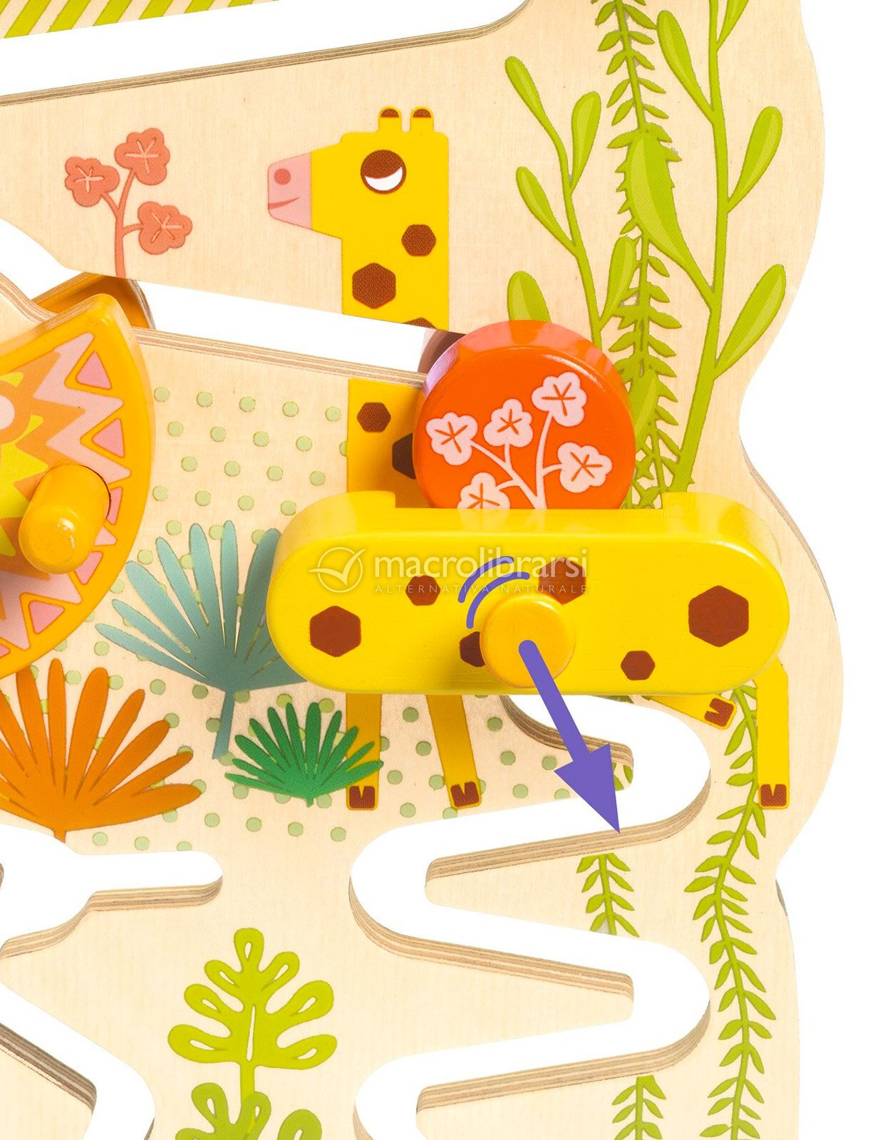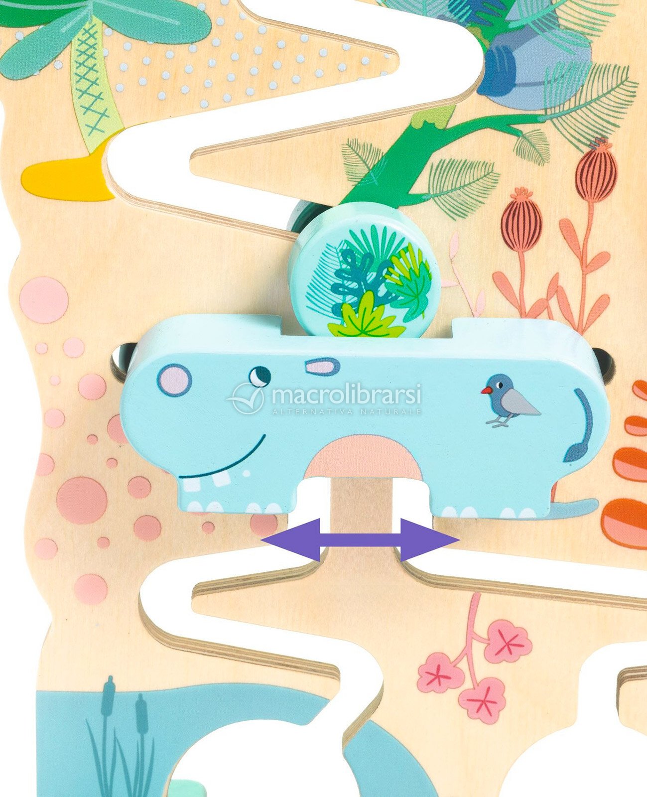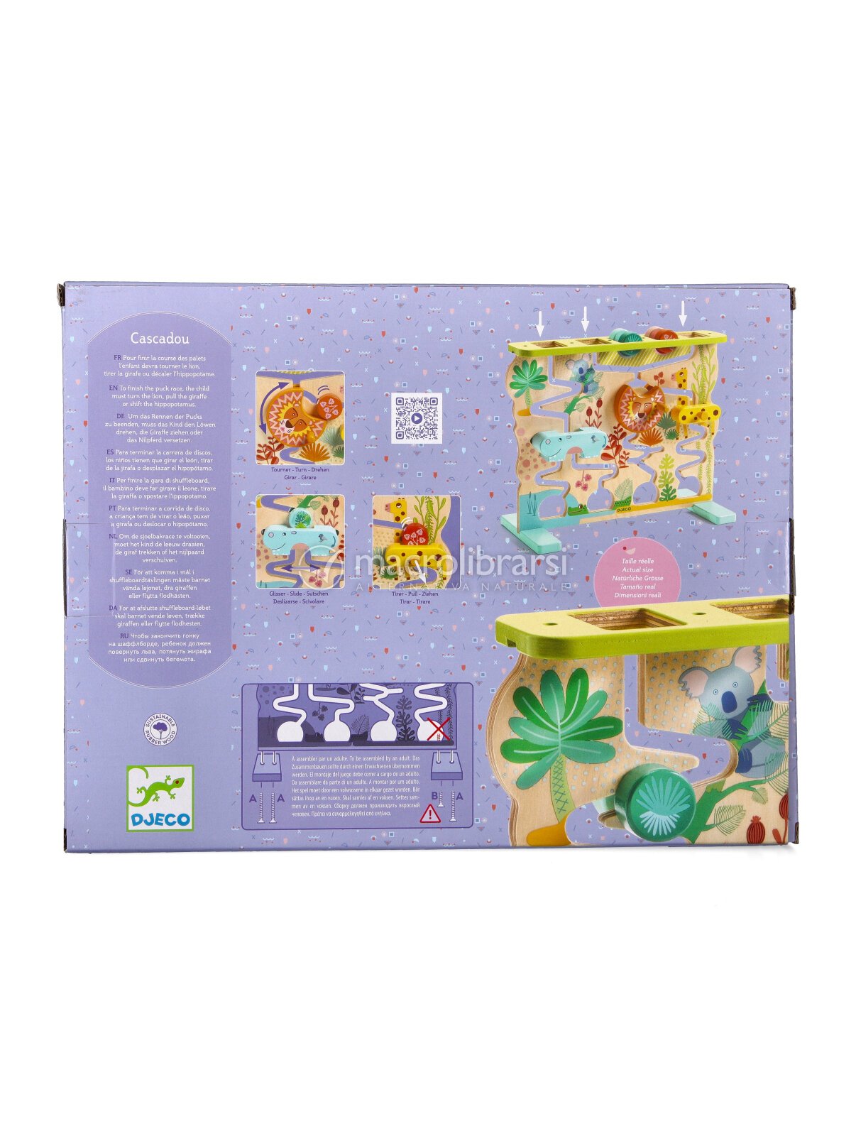 Il bambino posiziona i dischi colorati in uno dei tre ingressi superiori della cascata, osservandoli scivolare lentamente lungo il percorso. Ma a metà strada, la corsa si ferma: tre simpatici animali - un leone, una giraffa e un ippopotamo - bloccano il passaggio. Per proseguire, il piccolo giocatore dovrà agire: ruotare il leone, tirare la giraffa o spostare l’ippopotamo, completando così il percorso e sviluppando al tempo stesso precisione e senso causa-effetto.