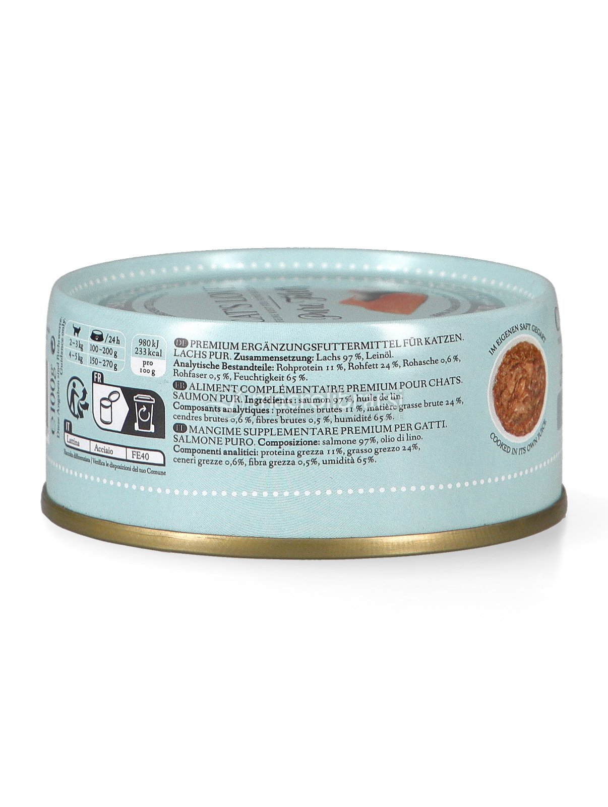 Saltuariamente ho acquistato questo specifico prodotto di Cat's Love, purtroppo il mio gatto Carlo (ex randagio di colonia) non lo ha mai nemmeno assaggiato. Eppure lui adora i croccantini della stessa marca e anche le bustine di anatra. Questa confezione di pollo e salmone è valida sotto ogni punto di vista: la qualità degli alimenti in pezzi scelti e non macinati, il buonissimo olio di lino per condimento, la quantità (100 gr) e infine il prezzo per niente elevato rispetto al prodotto. Il mio gatto è strano, forse lo disturba l'olio di lino che è un po'amaro (lo uso anch'io per condire), ma così salutare per la pelle e il pelo! In ogni caso io mi sento di consigliare questo prodotto per gatti come anche gli altri di Cat's Love, che si distinguono per la completa genuinità e l'alto livello delle materie prime. Credo che chi può, avendo un gattino piccolo , dovrebbe svezzarlo con questo tipo di alimenti per non cadere nella trappola del cibo spazzatura pieno di appetizzanti che tanto attira i mici.