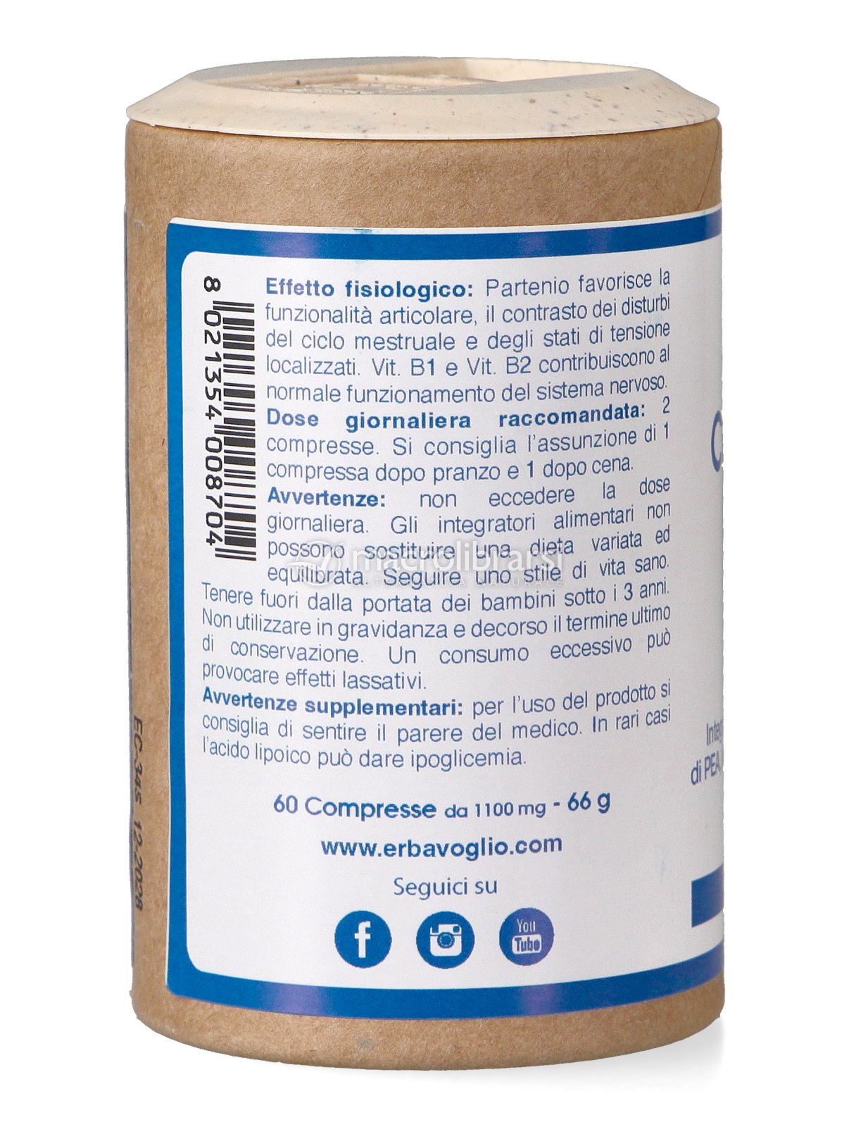 | Disclaimer | Non superare la dose giornaliera consigliata. Gli integratori alimentari non vanno intesi come sostituti di una dieta variata ed equilibrata. Tenere fuori dalla portata dei bambini al di sotto dei tre anni. Non utilizzare in gravidanza e nei bambini o comunque per periodi prolungati senza sentire il parere del medico. Conservare in luogo asciutto e lontano da fonti di calore. Richiudere la confezione dopo l'uso. Macrolibrarsi ricorda l'importanza di seguire uno stile di vita sano e un'alimentazione variata ed equilibrata. |