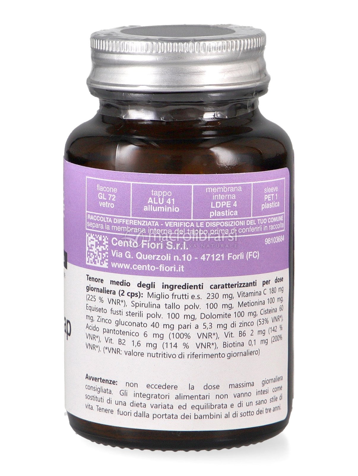 Contiene Miglio ed Equiseto, utili per favorire il naturale benessere di unghie e capelli, insieme a Spirulina ad azione di sostegno sul trofismo del tessuto connettivo.