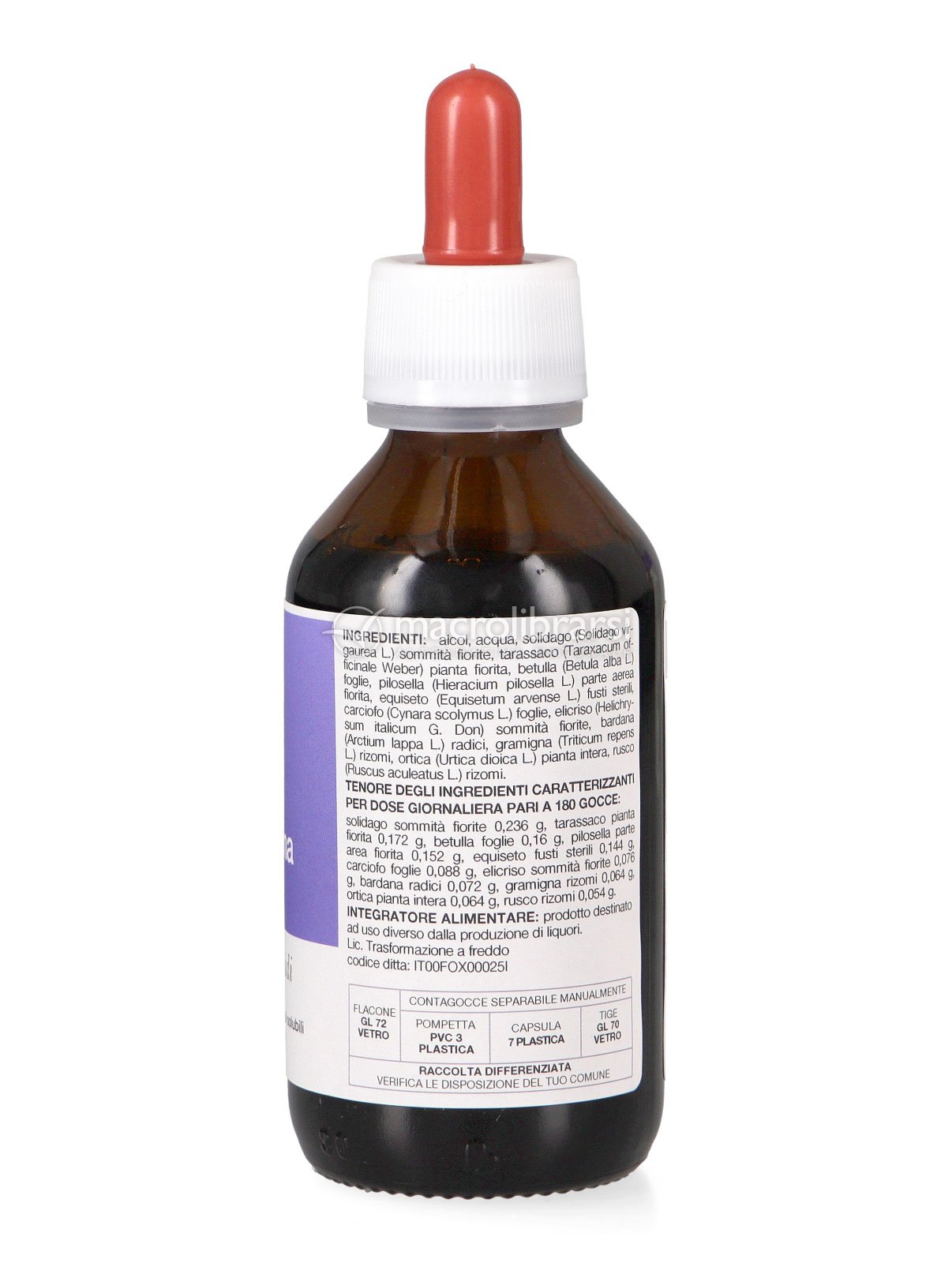Sinergia di Solidago, Tarassaco, Pilosella, Equiseto, Carciofo, Elicriso, Bardana, Gramigna, Rusco per favorire l'eliminazione dei liquidi in eccesso.