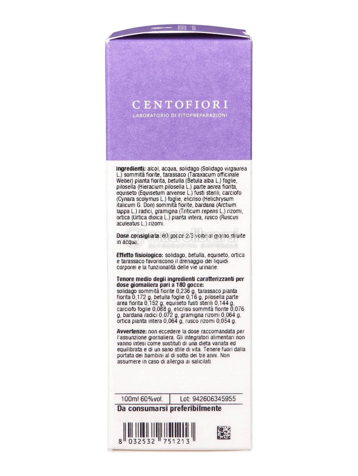 Centodrena di Centofiori è una miscela di soluzioni idroalcoliche studiata per favorire l'eliminazione dei liquidi in eccesso e purificare l'organismo. Contiene estratti di: