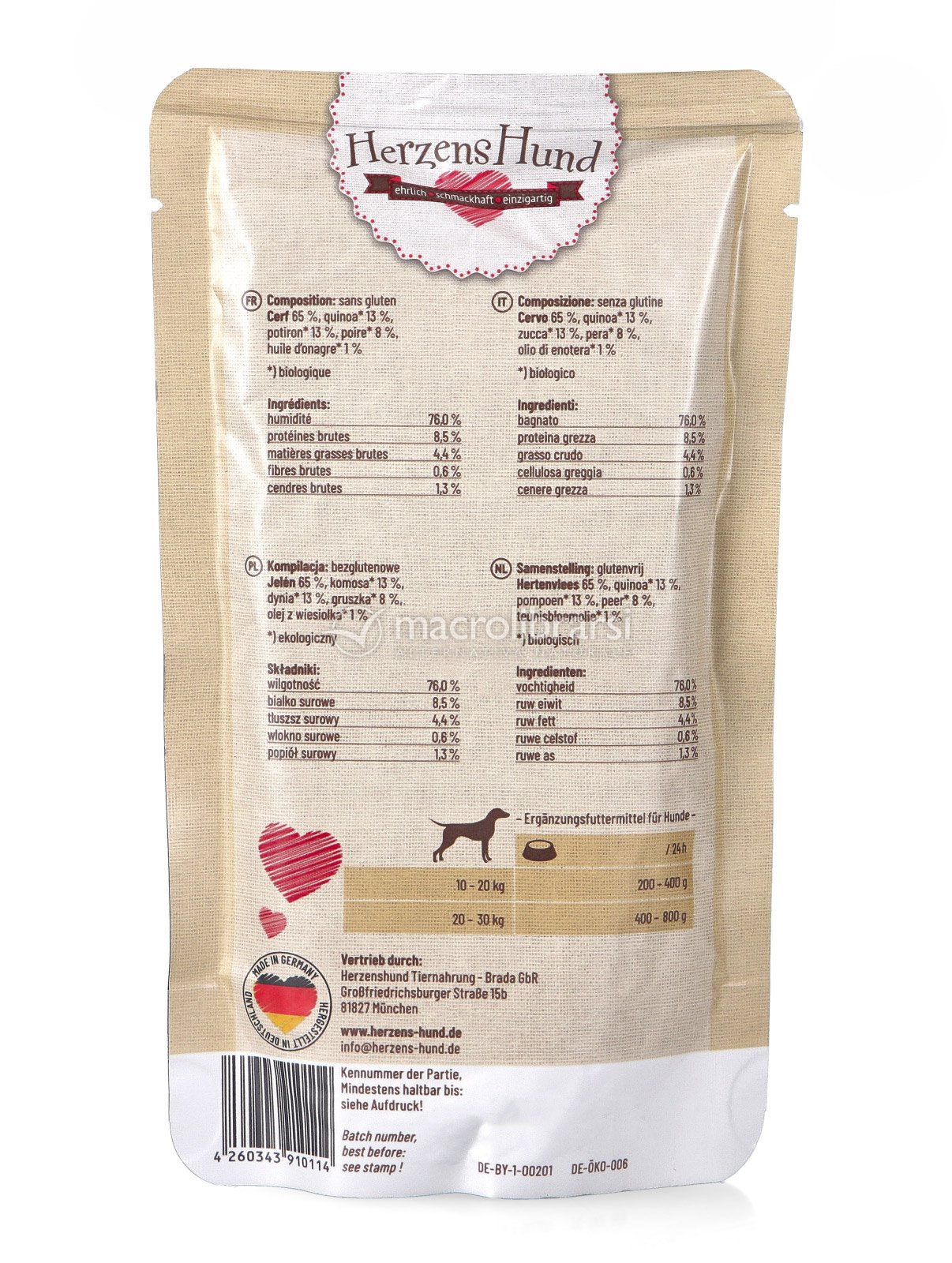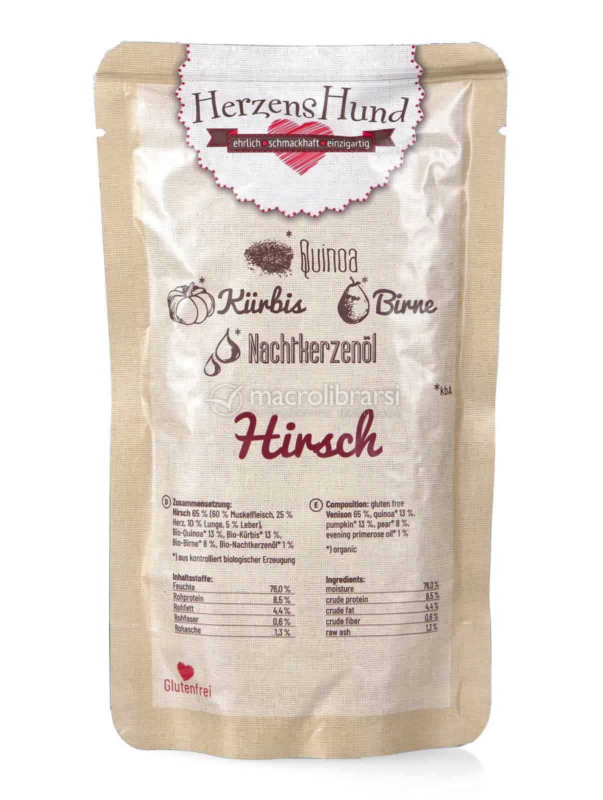 La carne utilizzata per il cibo umido di Herzens Hund non contiene né ormoni della crescita né antibiotici, mentre frutta e verdura sono totalmente prive di pesticidi e fertilizzanti chimici.