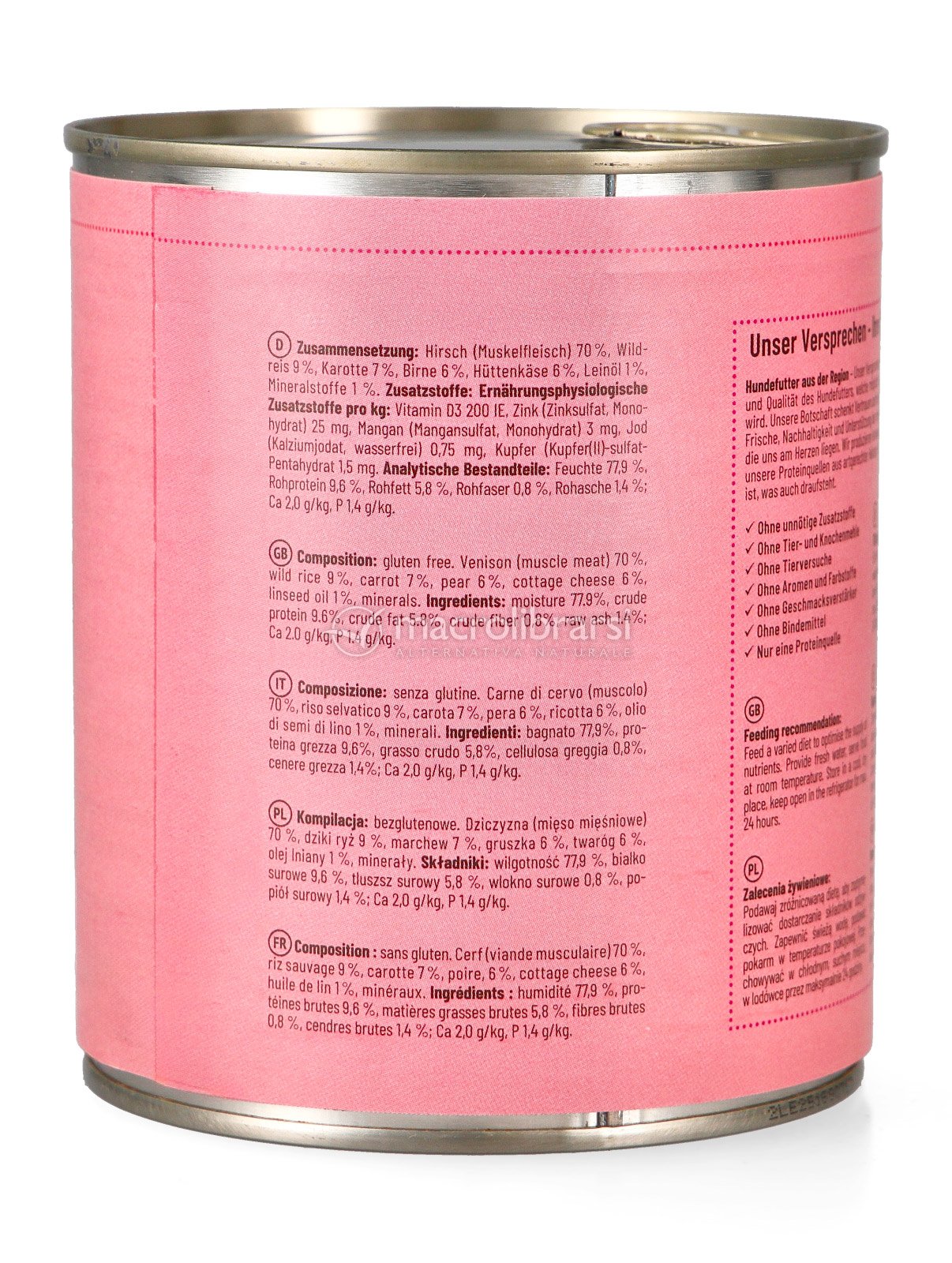 Carne di muscolo di cervo 70%, riso selvatico 9%, carota 7%, pera 6%, ricotta 6%, olio di lino 1%, minerali 1%.
