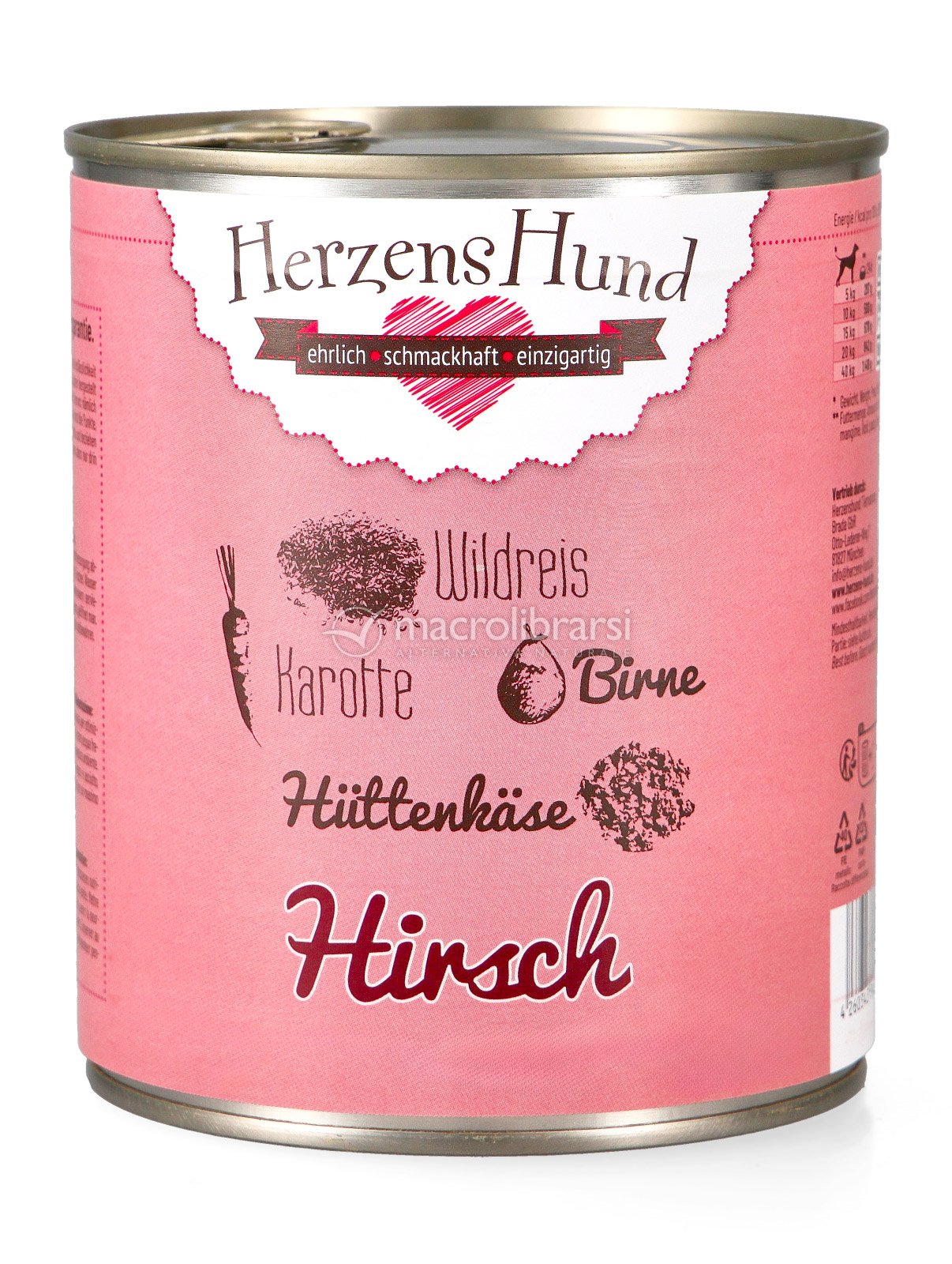 Umido completo naturale per cani adulti che combina la carne magra di cervo con riso selvatico, carote fresche, pere e ricotta: il menù perfetto anche per cani con digestione sensibile.