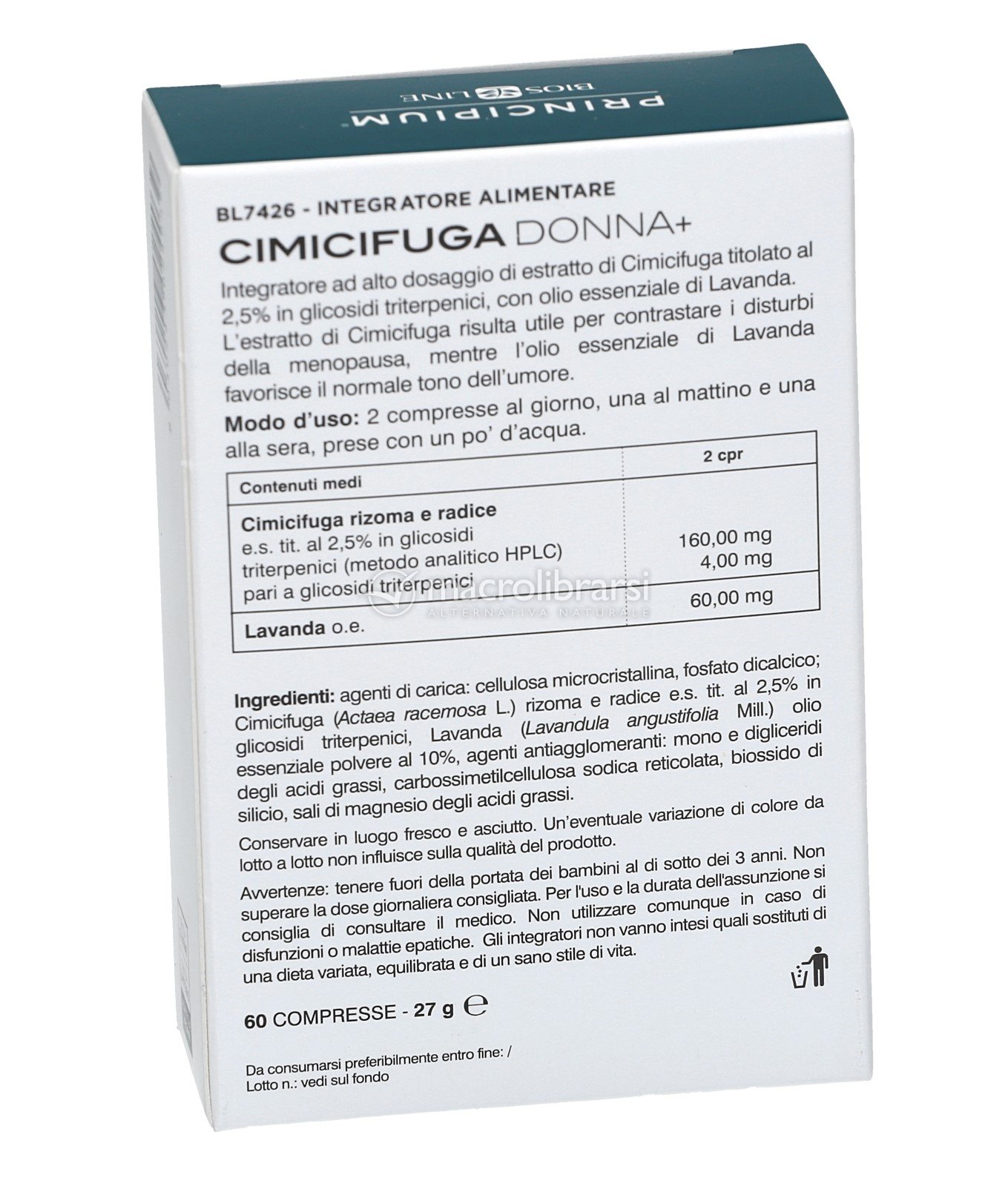 Disclaimer | Non superare la dose giornaliera consigliata. Gli integratori alimentari non vanno intesi come sostituti di una dieta variata ed equilibrata. Tenere fuori dalla portata dei bambini al di sotto dei tre anni. Non utilizzare in gravidanza e nei bambini o comunque per periodi prolungati senza sentire il parere del medico. Conservare in luogo asciutto e lontano da fonti di calore. Richiudere la confezione dopo l'uso. Macrolibrarsi ricorda l'importanza di seguire uno stile di vita sano e un'alimentazione variata ed equilibrata. |