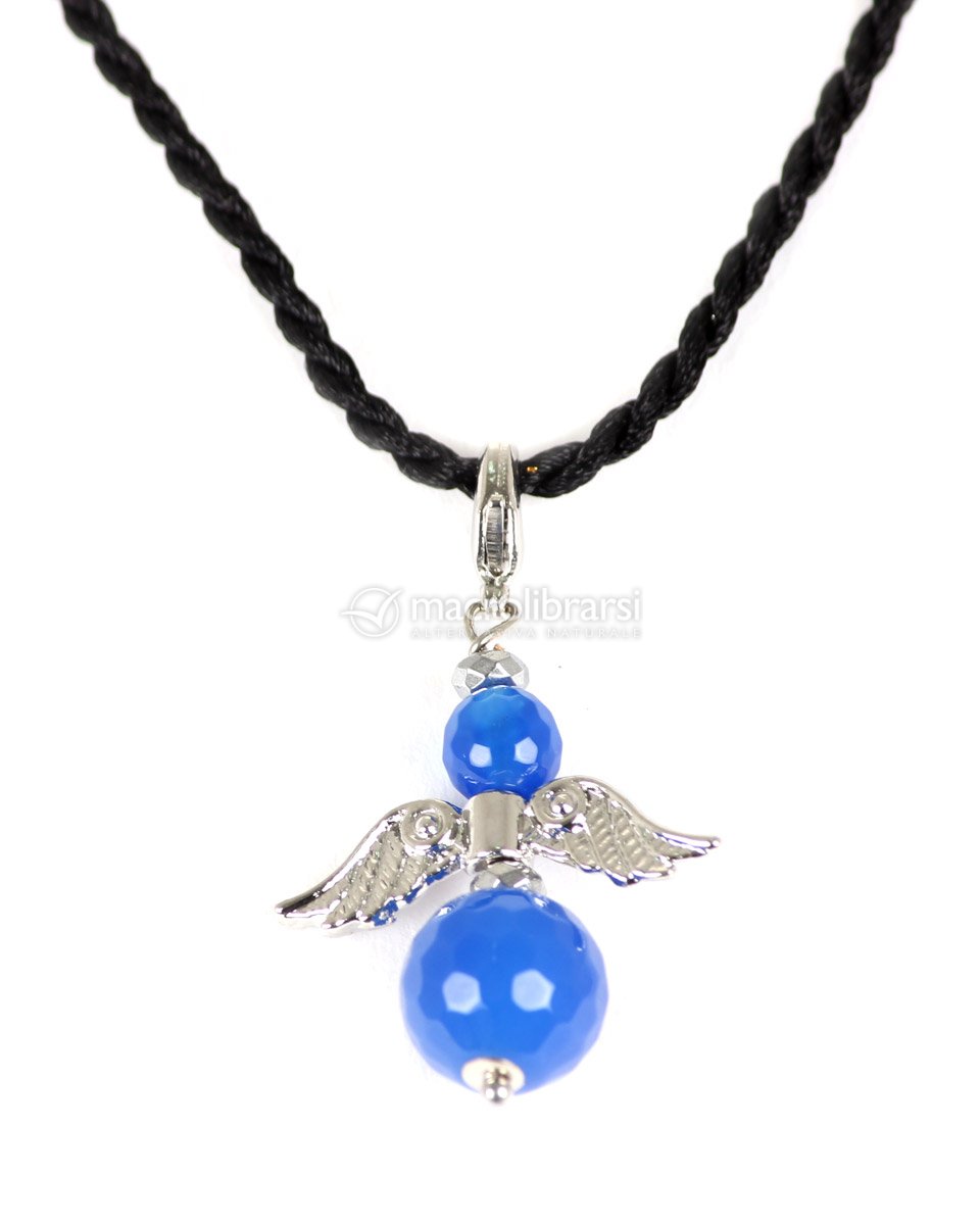 Un ciondolo di medie dimensioni pensato per sentire sempre accanto a te la presenza del tuo Angelo custode. E' realizzato con due perle sfaccettate in agata blu e due piccole ali incise e un gancetto in metallo color argento.