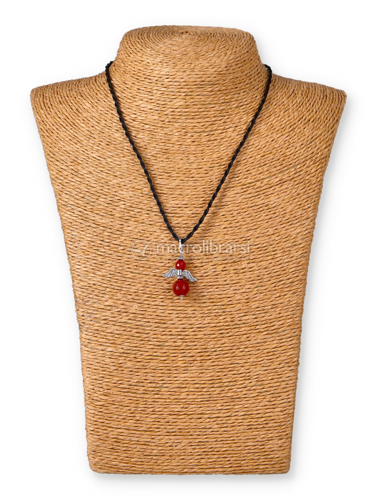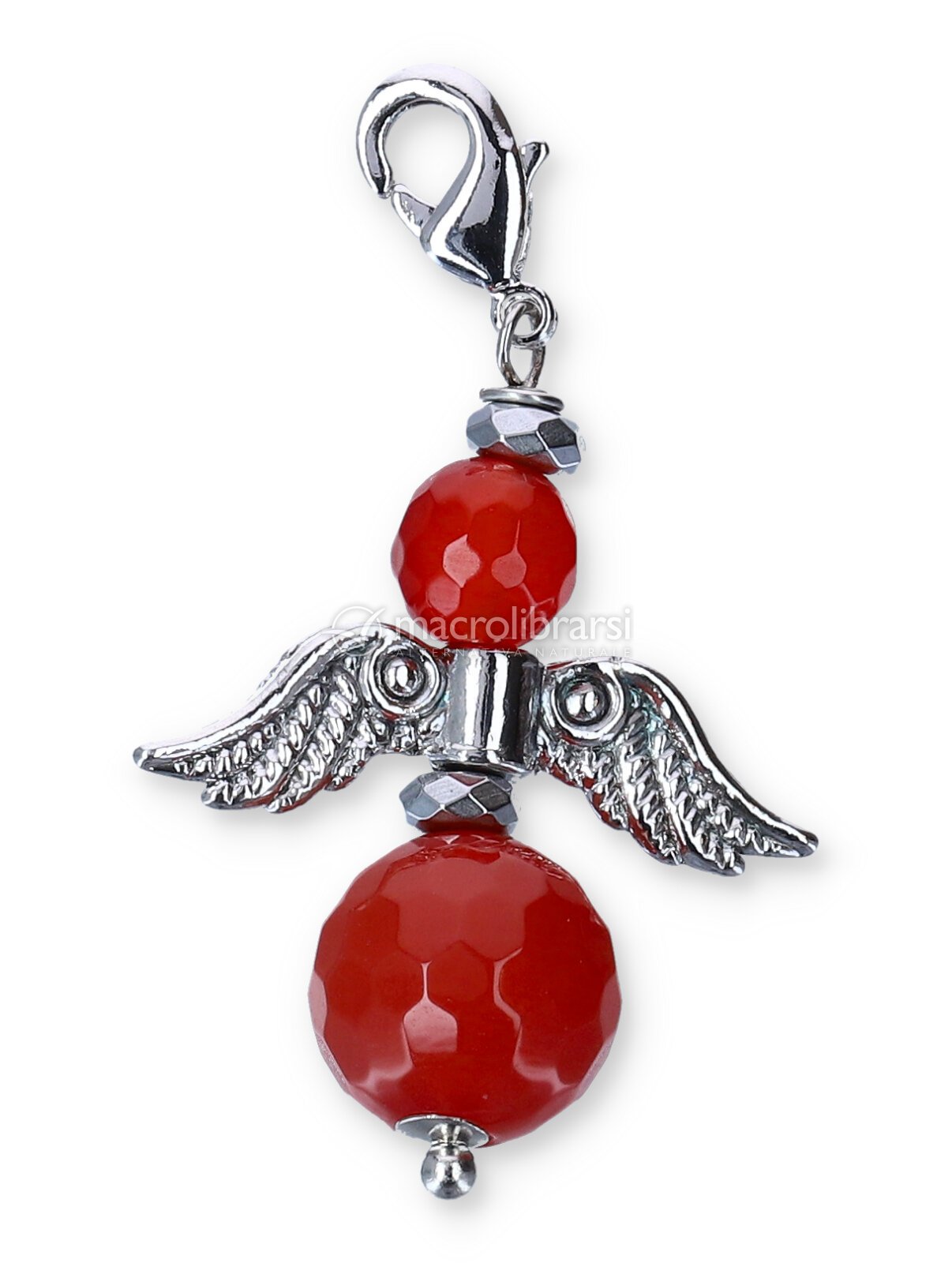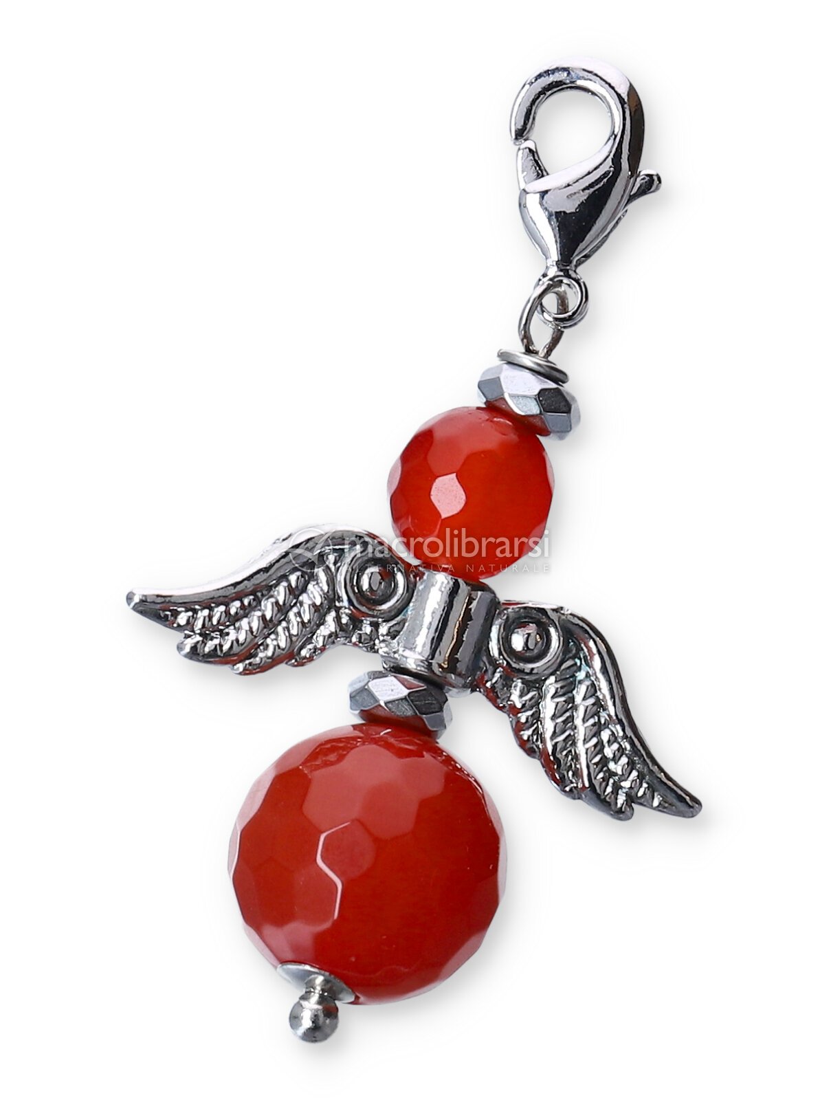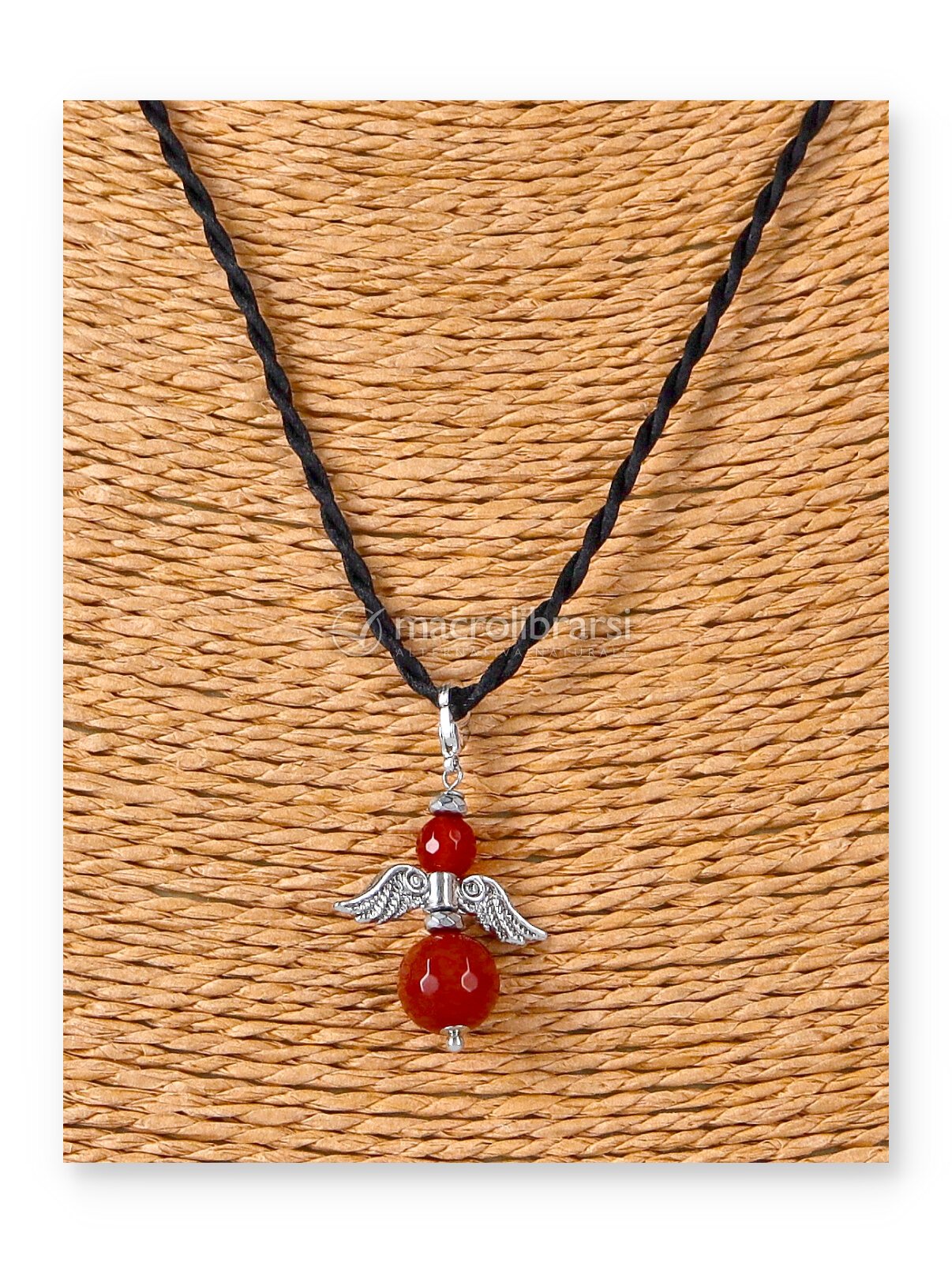 Un ciondolo di medie dimensioni pensato per sentire sempre accanto a te la presenza del tuo Angelo custode. E' realizzato con due perle sfaccettate in cornioladue piccole ali incise e un gancetto in metallo color argento.