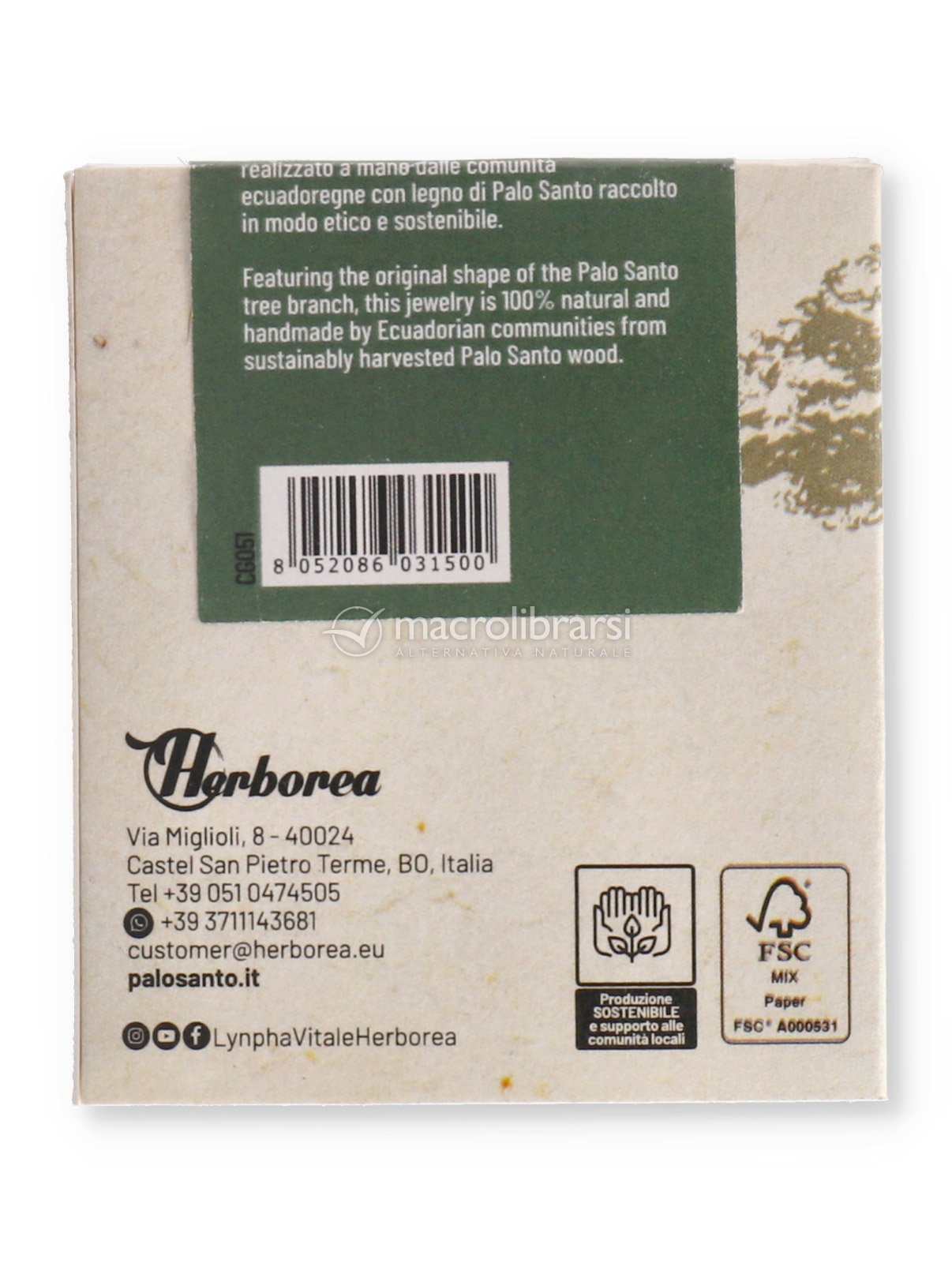 Viene realizzato interamente a mano dalle famiglie locali del sud dell’Ecuador, nel pieno rispetto dell’ecosistema, utilizzando esclusivamente legno di Palo Santo raccolto a terra al termine del suo naturale ciclo di vita. Ogni ciondolo è un pezzo unico: la sua forma riproduce la sezione naturale del ramo dell’albero di Palo Santo, rendendo ogni creazione irripetibile.