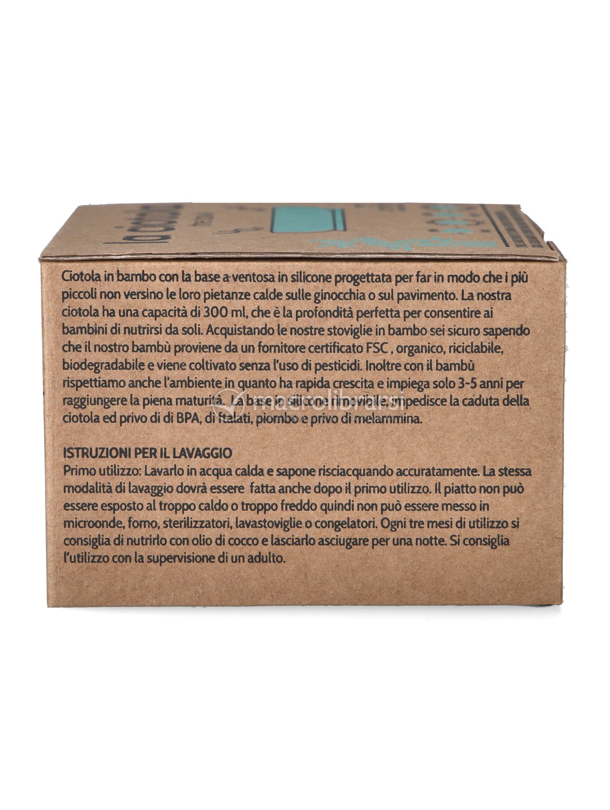 | Note | Una volta ogni 3 mesi il piatto può essere trattato con olio di cocco alimentare per mantenere il bambù in perfetto stato: mettere un po' d'olio su uno straccetto e strofinare su tutta la superficie, lasciando asciugare per una notte. |