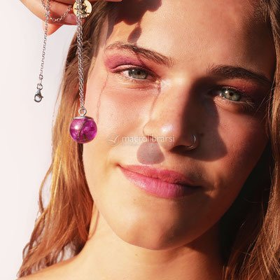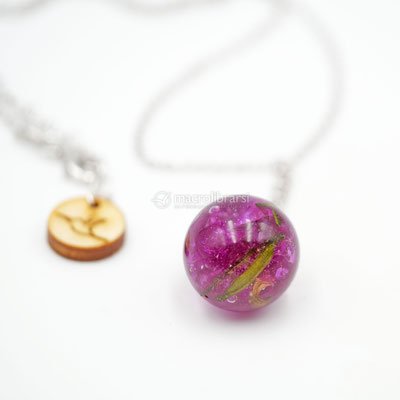 - ciondolo: pallina in resina con fiori di Buganvillea dal nostro giardino, diametro 1cm, con coppetta in argento sterling 925°°° rodiato.