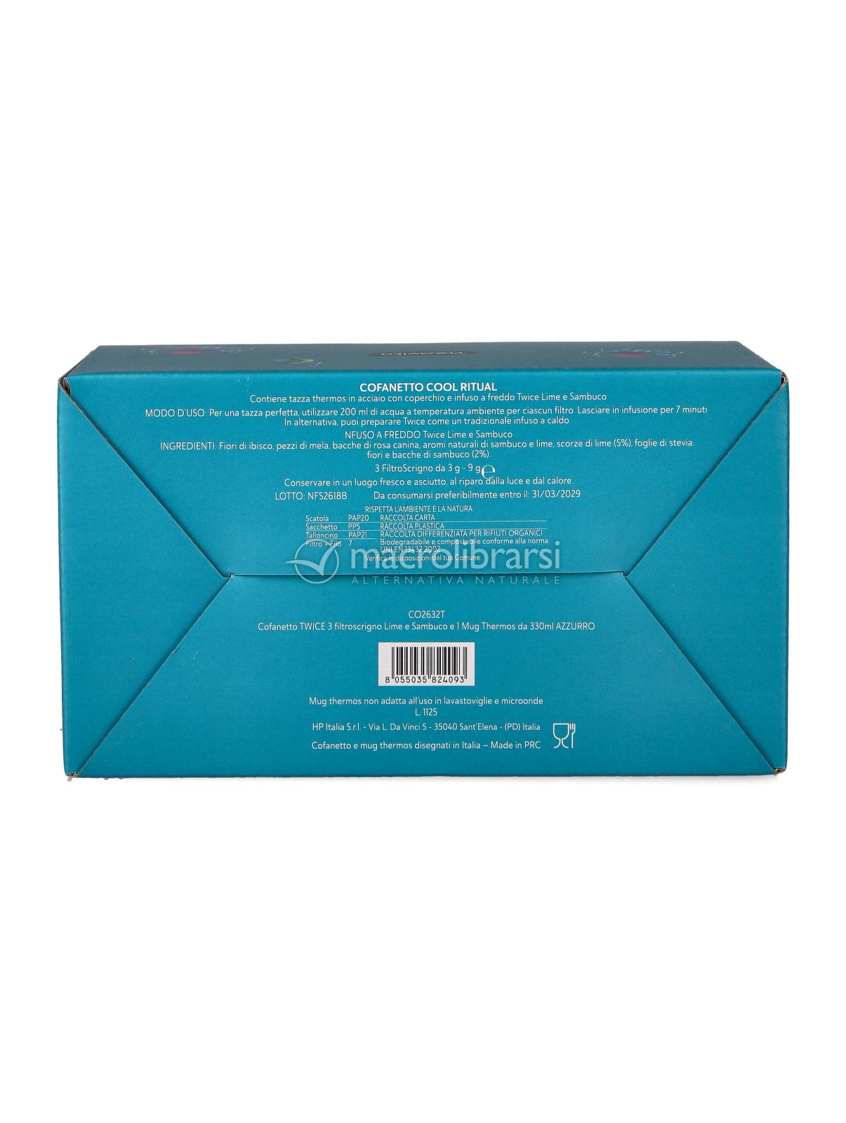 All’interno trovi una mug thermos in acciaio “Deep Blu” con coperchio, perfetta per mantenere la tua bevanda fresca più a lungo, insieme a 3 filtri di infuso a freddo Twice Lime e Sambuco, dal gusto sorprendente, fruttato e rivitalizzante.