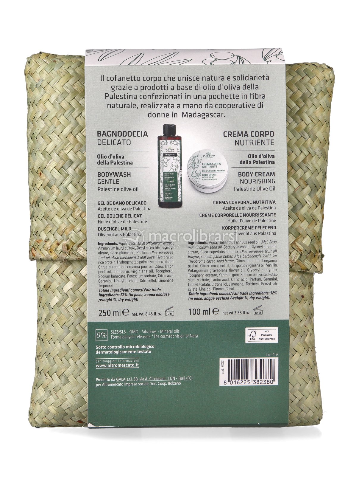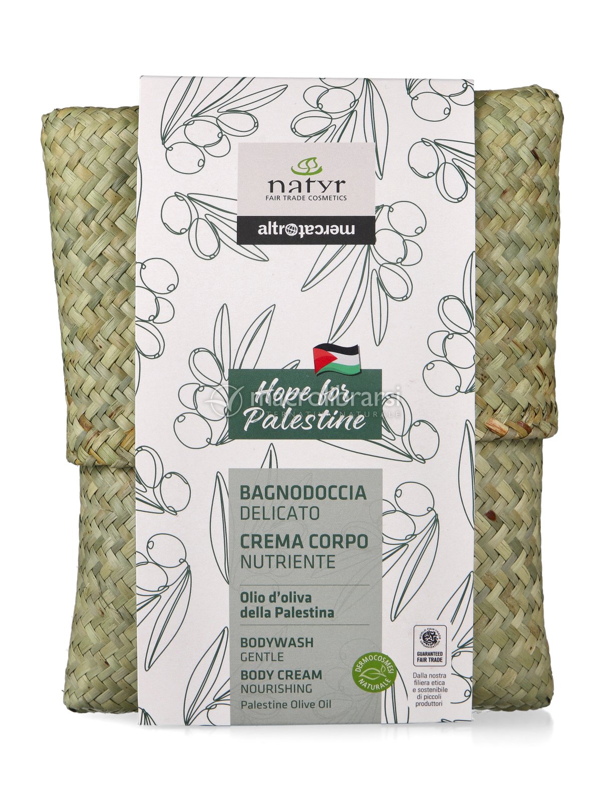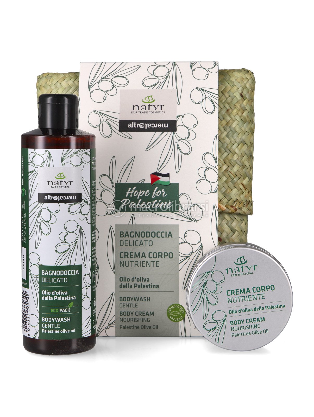 Il Cofanetto Corpo Hope di Natyr è un'idea regalo che unisce natura e solidarietà con due prodotti a base di olio d’oliva della Palestina, confezionati in una pochette naturale in fibra naturale realizzata a mano in Madagascar.
