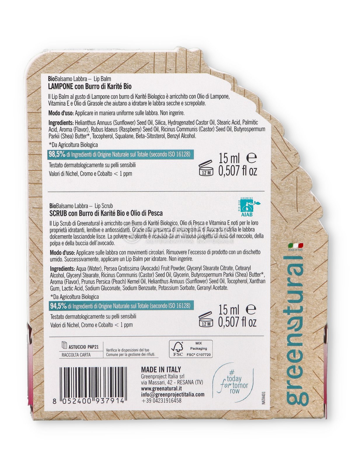 | Confezione | Lip Scrub (15 ml) + Lip Balm Lampone (15 ml) |