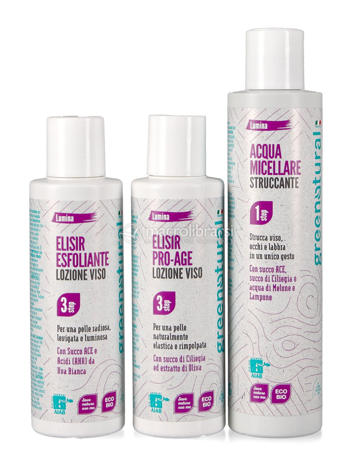 Greenatural ha pensato alla routine della linea Lumina per una corretta detersione, tonificazione ed esfoliazione della pelle con pochi ma efficaci prodotti:
