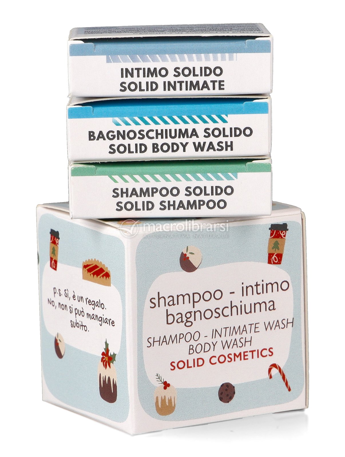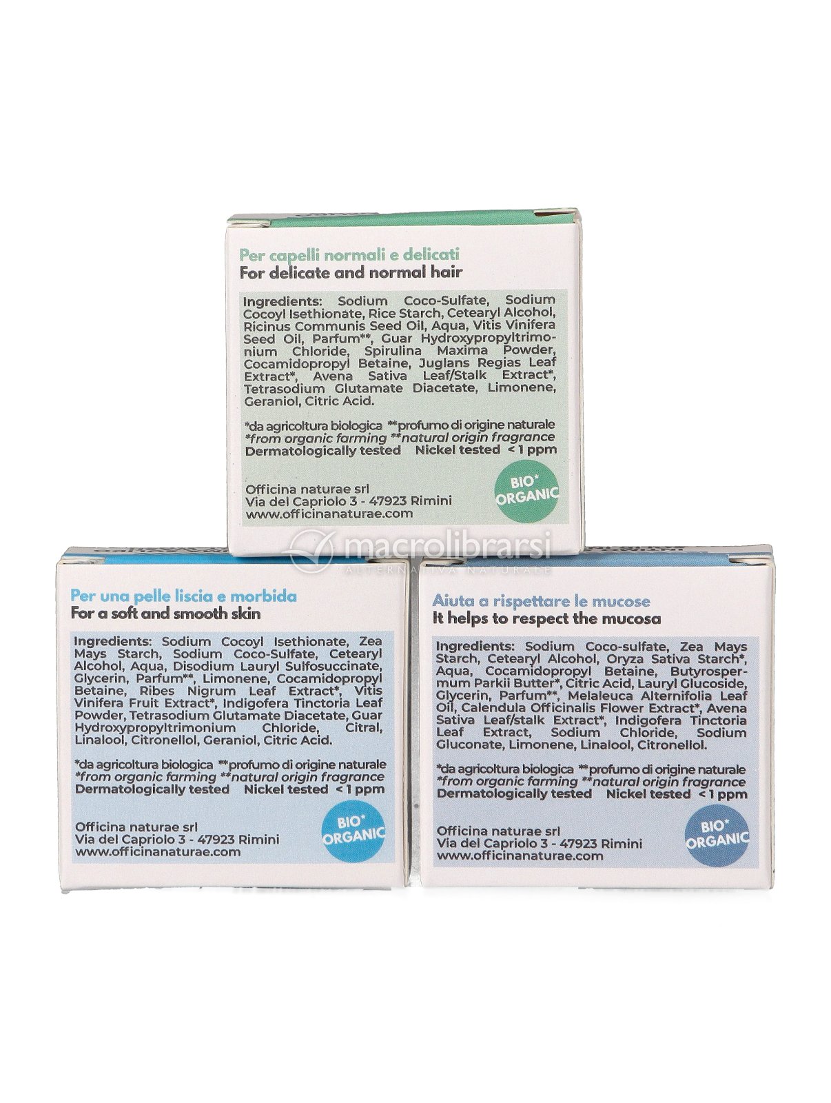 | Confezione | Shampoo solido nutriente (15 g), Intimo delicato (15 g), Bagnoschiuma vellutante (15 g) |