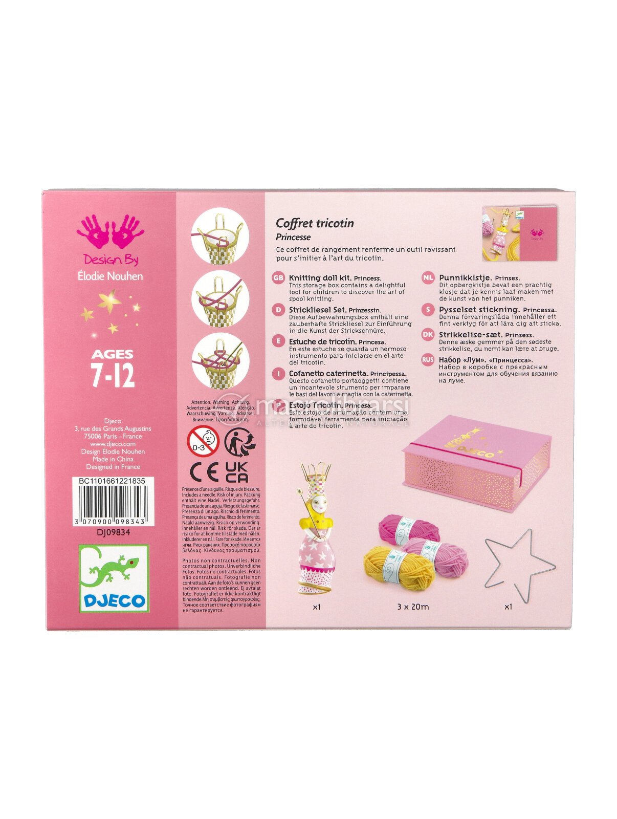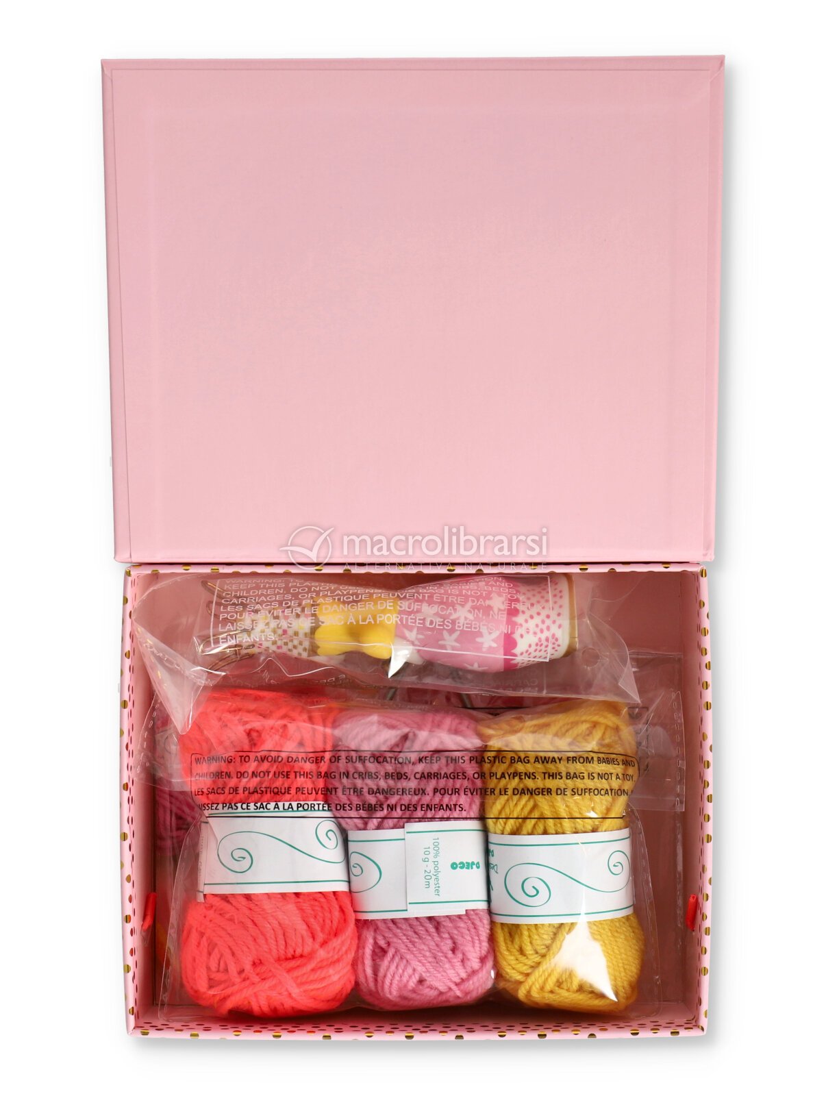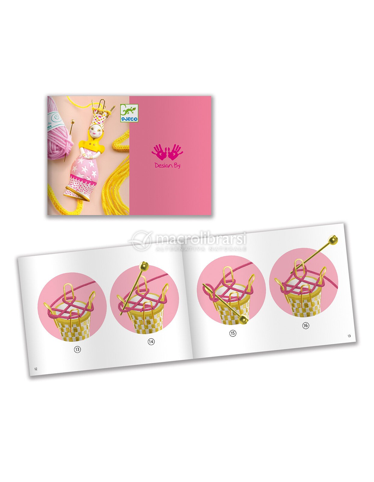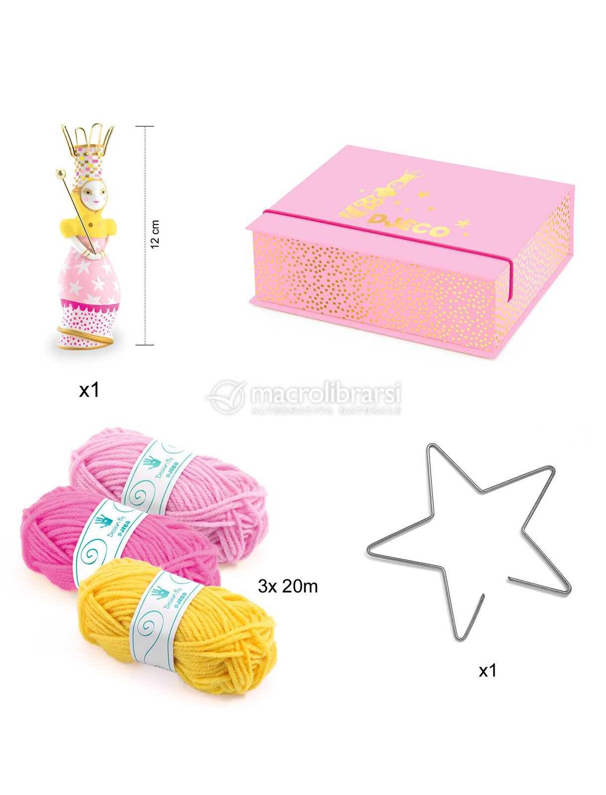 All'interno, uno strumento a forma di principessa (chiamata "caterinetta" o "tricottino") e 3 gomitoli di lana colorata (rosa, gialla, fuxia) per realizzare tante cordelle tubolari che serviranno per creare graziose decorazioni. Una sagoma in metallo completa questo materiale per realizzare, grazie alle istruzioni illustrate, una graziosa stella cadente da appendere.