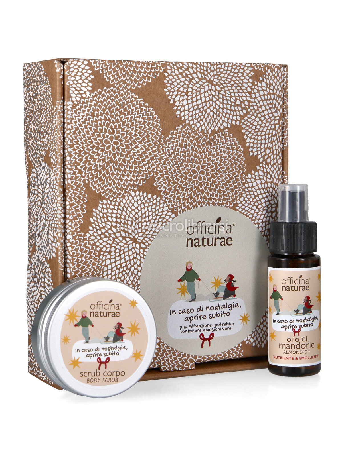 Regala un momento di benessere con il cofanetto Officina Naturae “In Caso di Nostalgia Aprire Subito”. Lo scrub corpo leviga delicatamente lasciando la pelle morbida e luminosa; l’olio di mandorle nutre ed elasticizza, esaltando il naturale splendore dell’epidermide. Fragranza calda e confortevole, packaging pronto regalo.