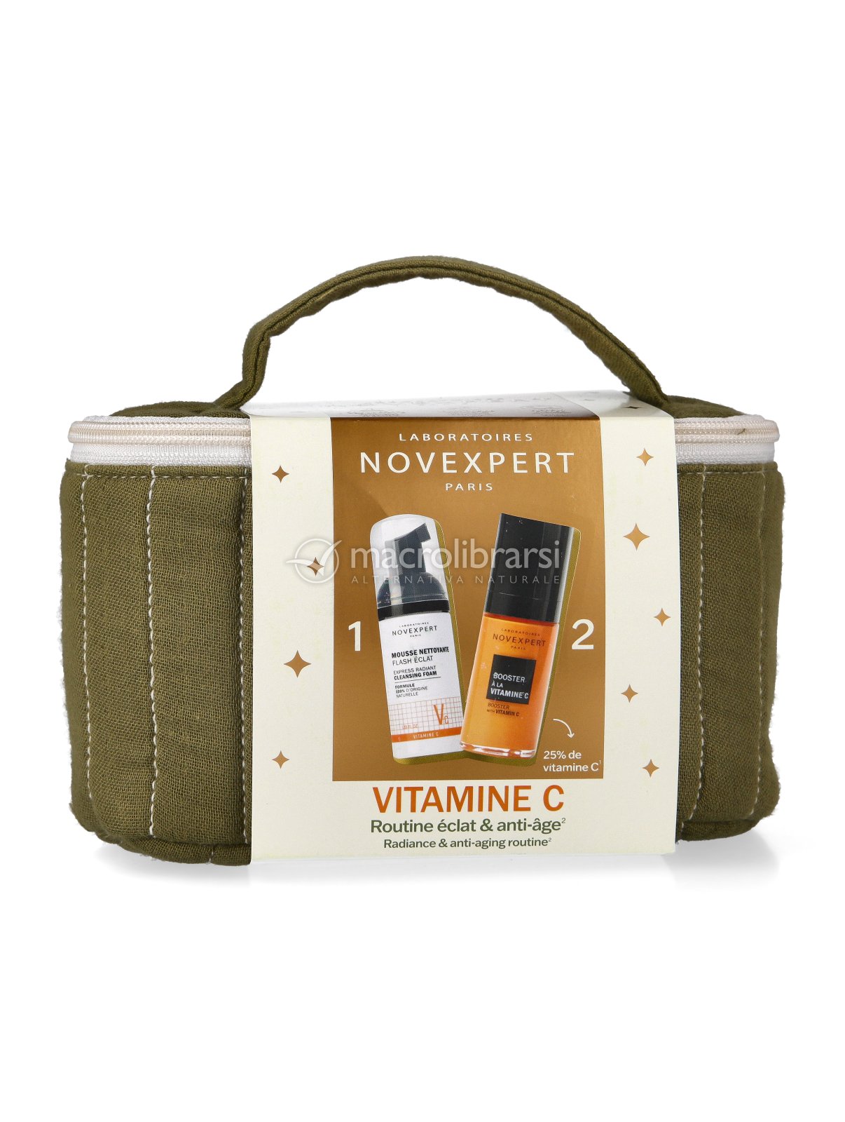 Elegante trousse in cotone firmata Laboratoires Novexpert con protagonista la vitamina C per una pelle luminosa e perfetta.