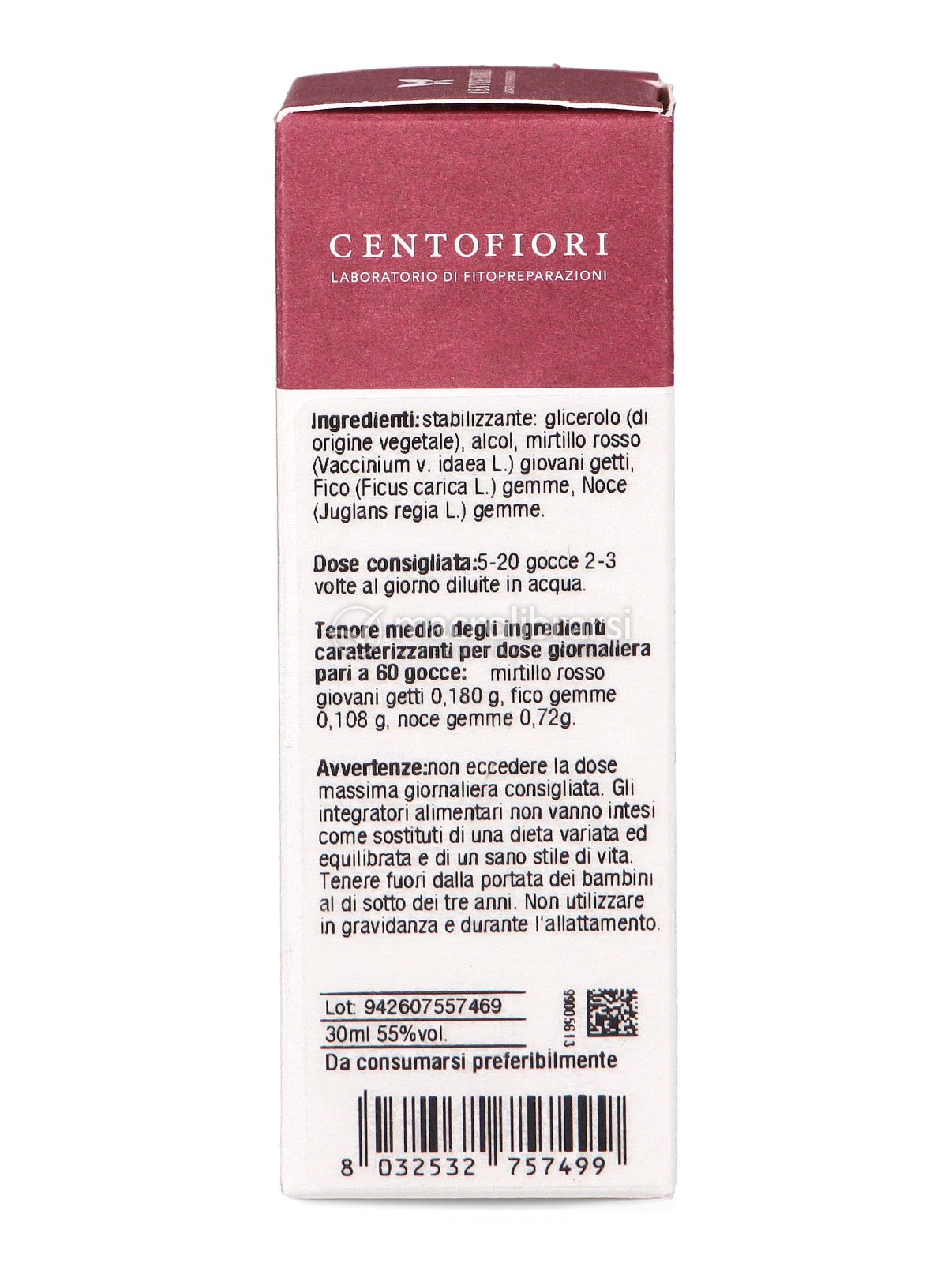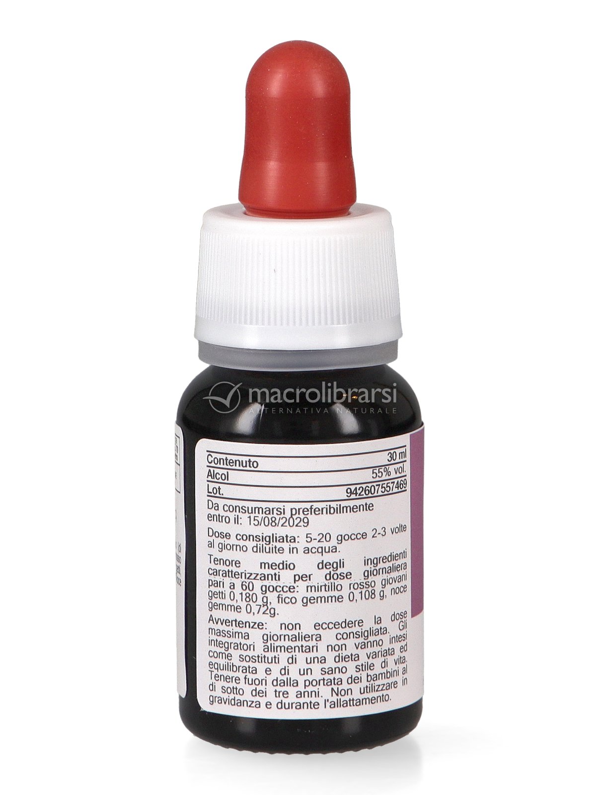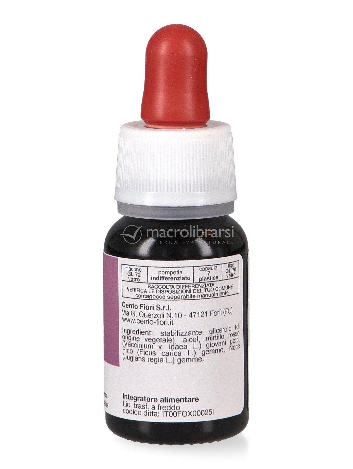 Macerato di gemme fresche di Mirtillo rosso, Fico e Noce, macerate in alcool e glicerolo vegetale.