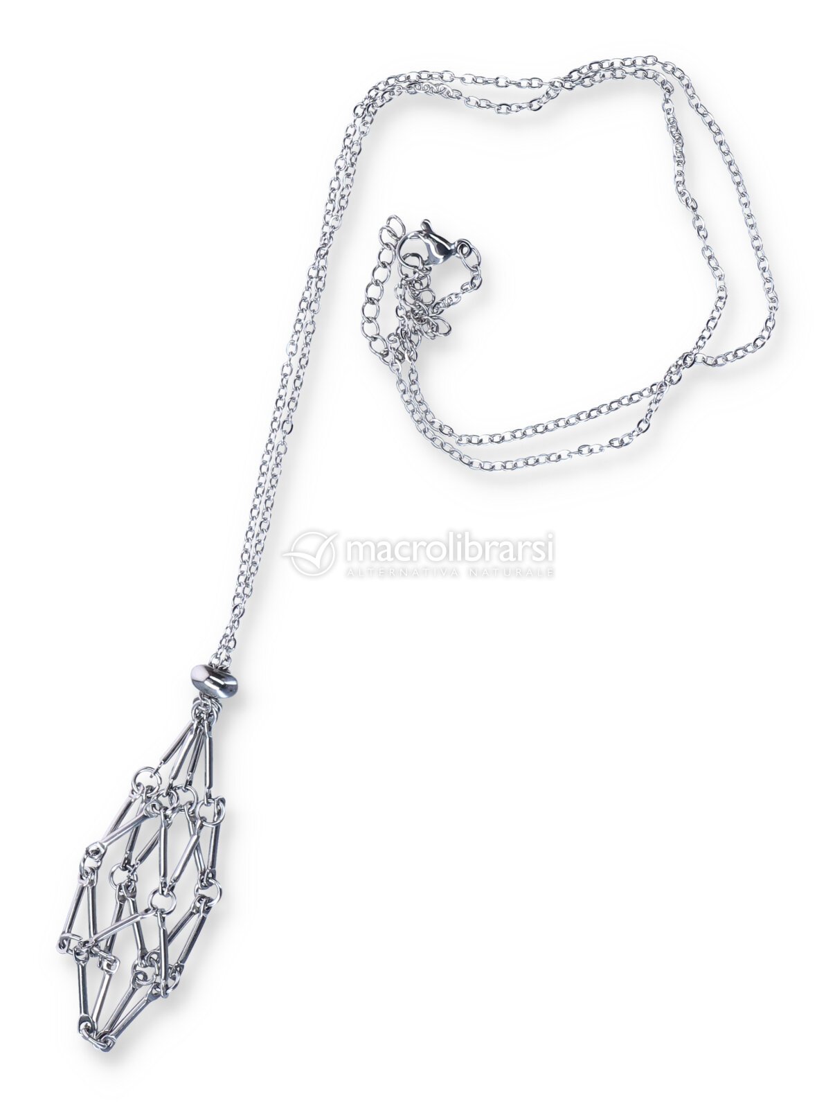 La collana BioRadhika in acciaio inossidabile con gabbietta porta pietra è un gioiello che offre la possibilità di personalizzare il proprio look con diverse pietre.