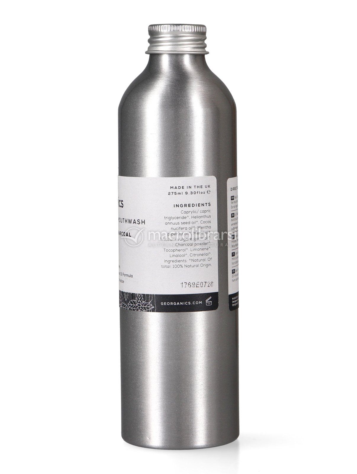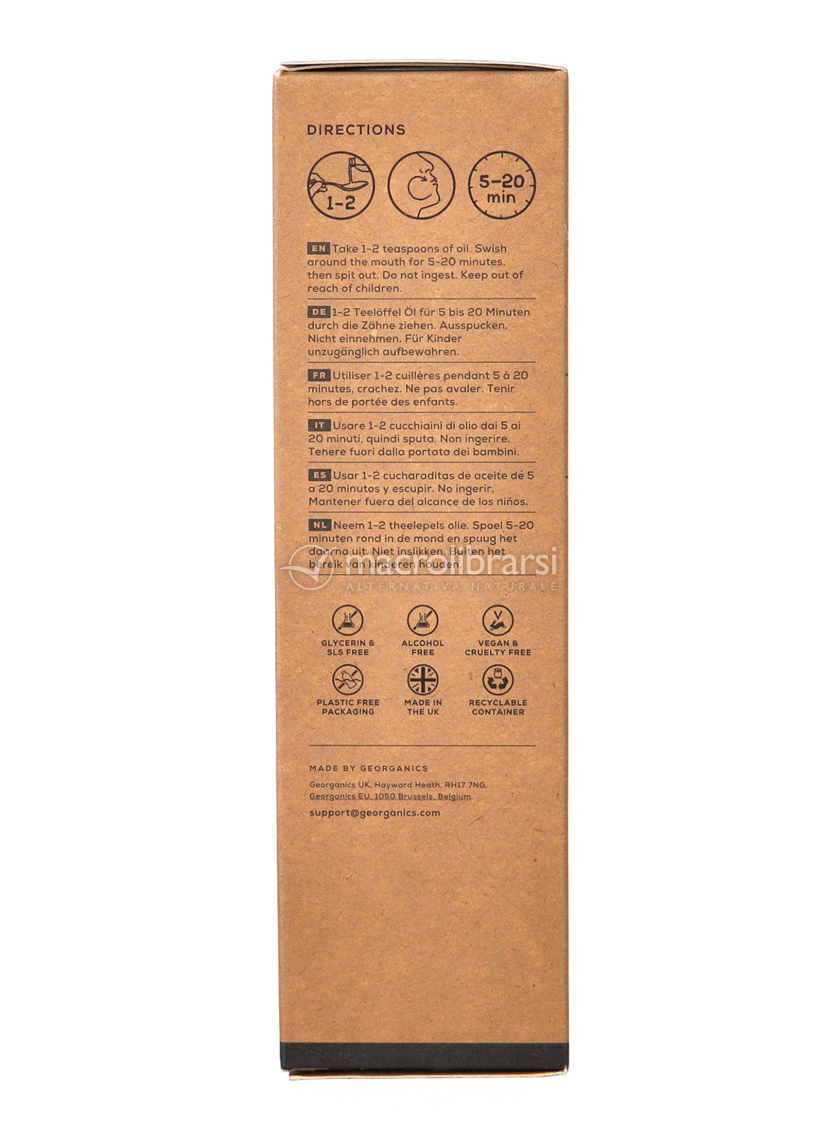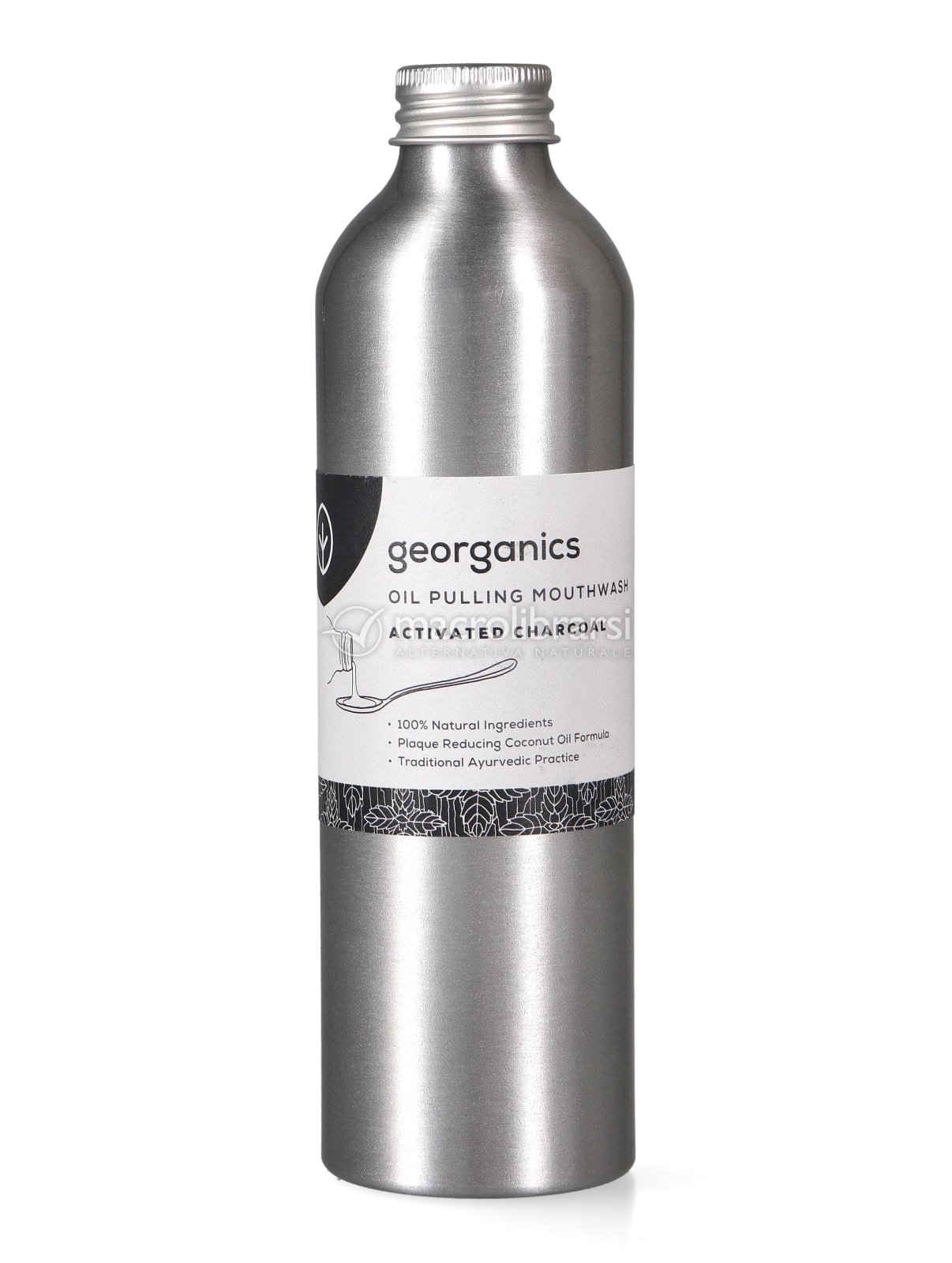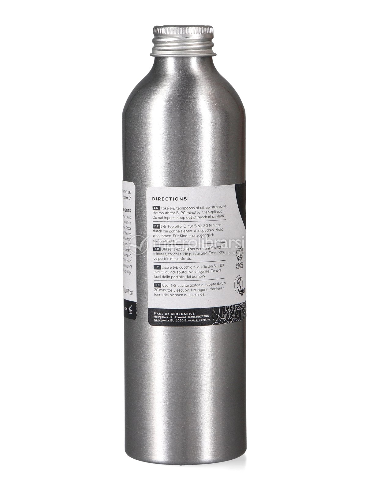 Collutorio naturale per oil pulling arricchito con olio di menta piperita biologico e carbone attivo per un'azione rinfrescante e antimacchia completa.