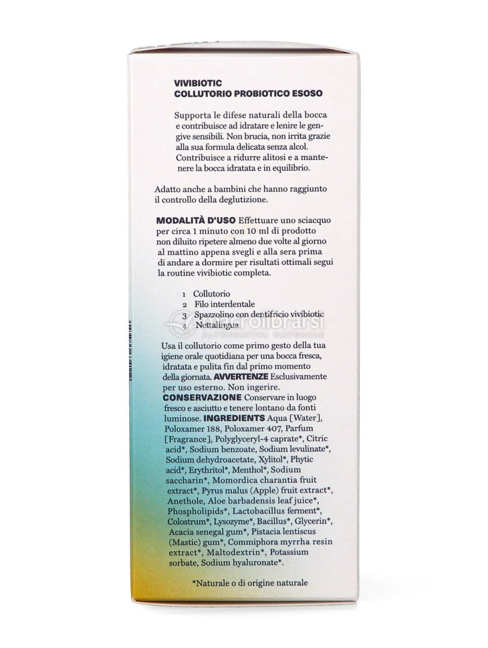 La formula del Collutorio Esoso Vivibiotic integra esosomi vegetali, fosfolipidi, probiotici e un sistema microbiologico attivo per sostenere le gengive, modulare il biofilm orale e favorire la naturale capacità di rigenerazione dei tessuti delle mucose.