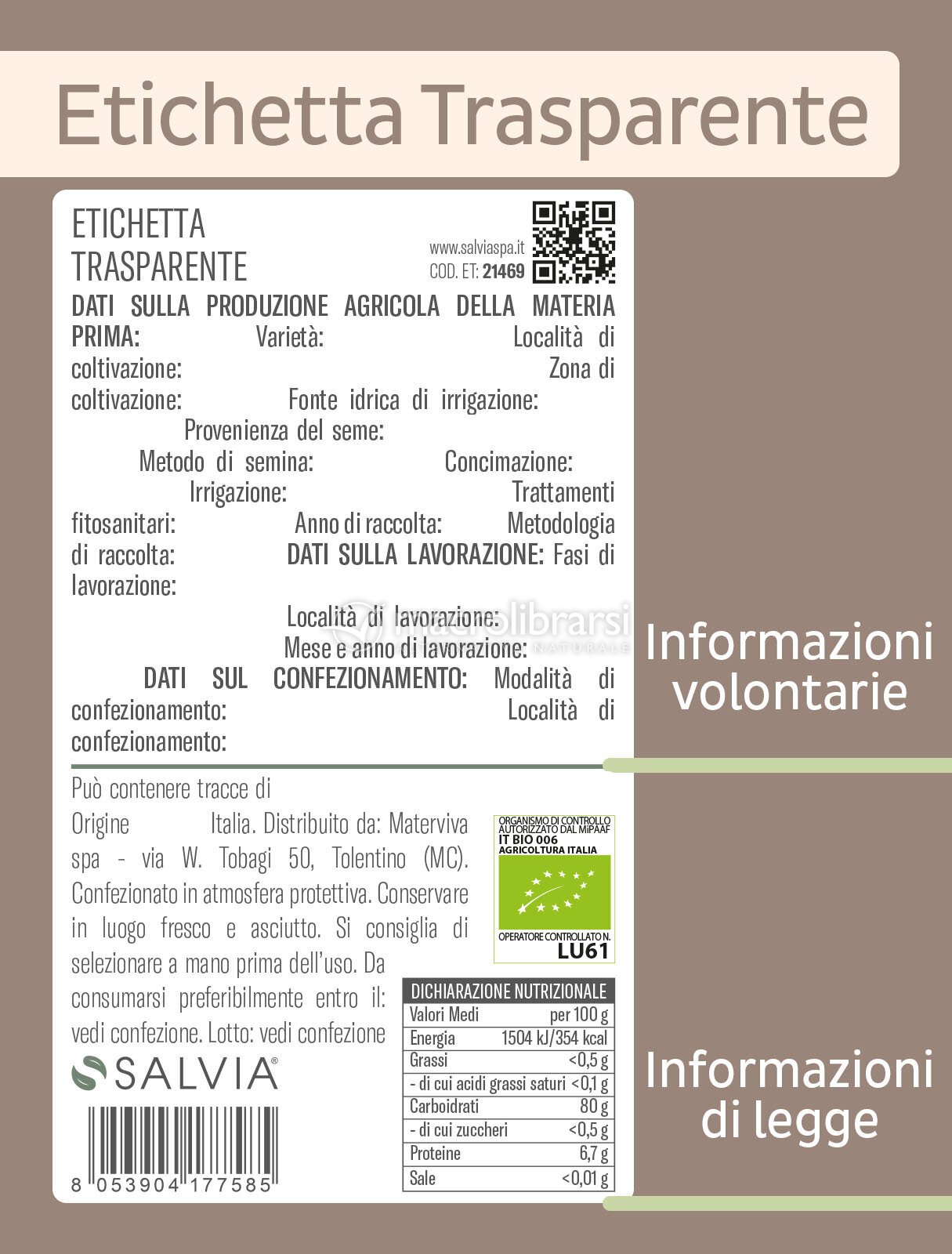 Tutti i prodotti di Salvia sono accompagnati dall'Etichetta Trasparente, ovvero, da un'etichetta che riporta le informazioni relative all’origine e alle caratteristiche delle materie prime, alle lavorazioni, al confezionamento, per: