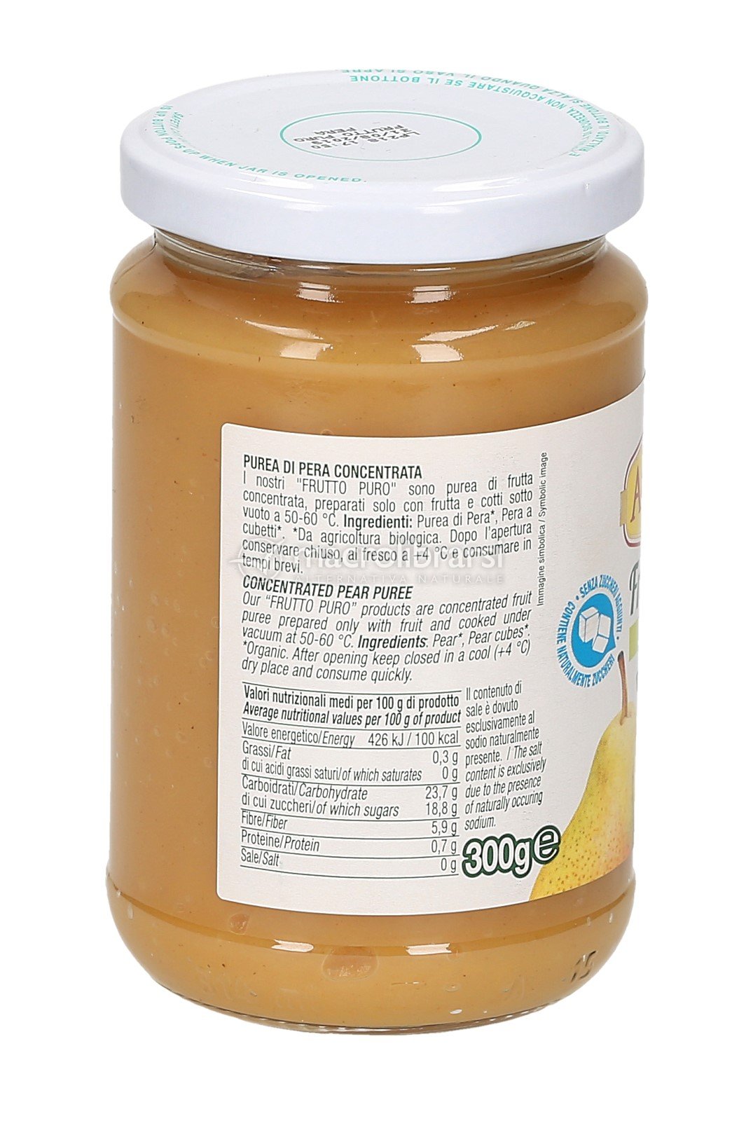 Purea di pere semplice e naturale, solo il sapore della frutta in purezza, senza aggiunta di altri ingredienti. Inoltre la frutta è cotta a basse temperature e mantiene così inalterate tutte le sue proprietà.