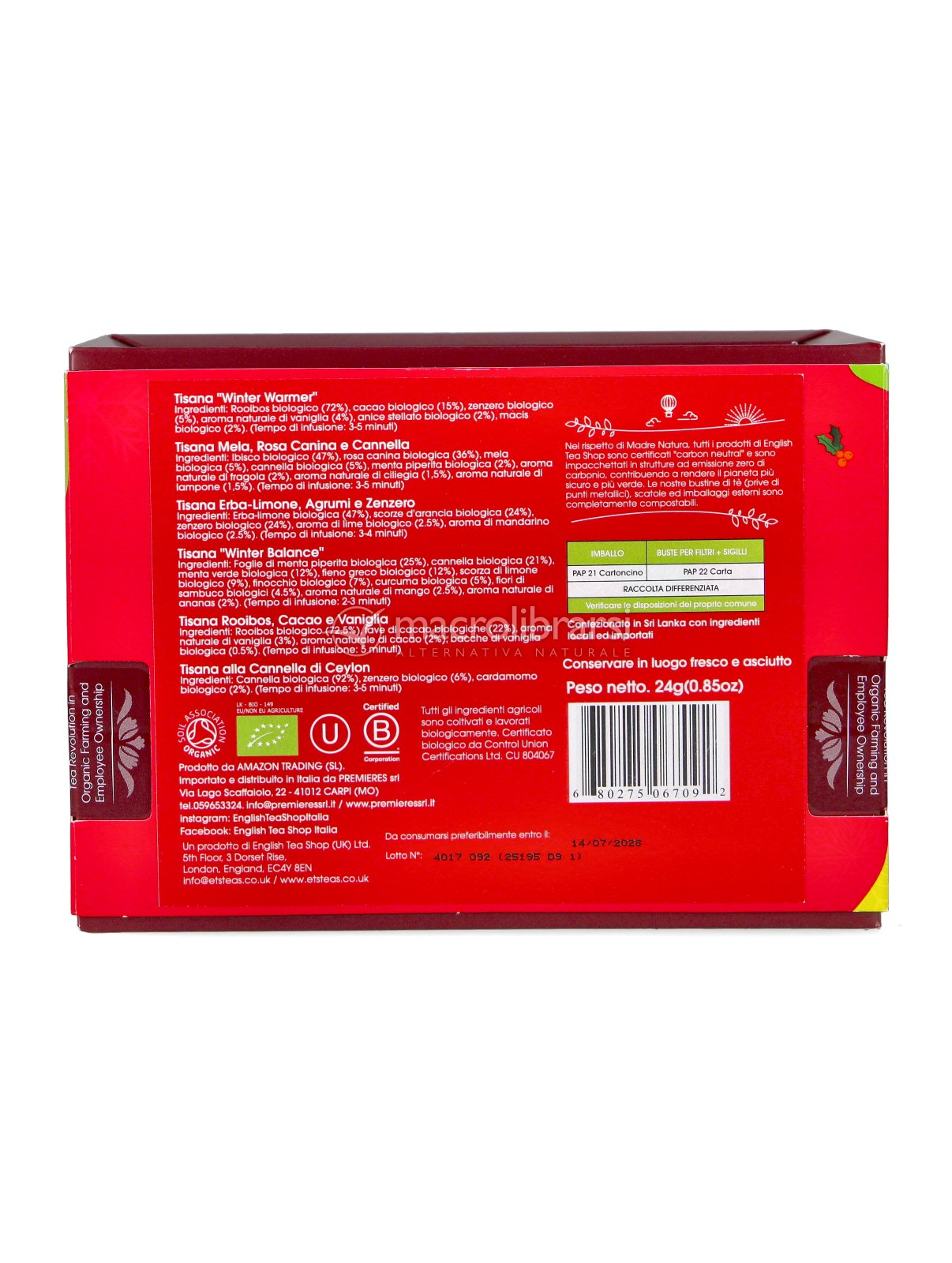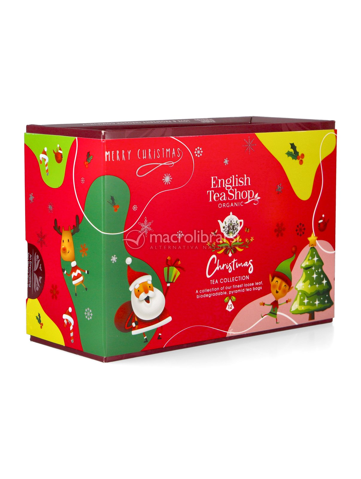 Set regalo con 12 tè natalizi di English Tea Shop. Varietà assortite speziate, fruttate e agrumate, perfette come decorazioni, da appendere all'albero di Natale o segnaposto a tavola!