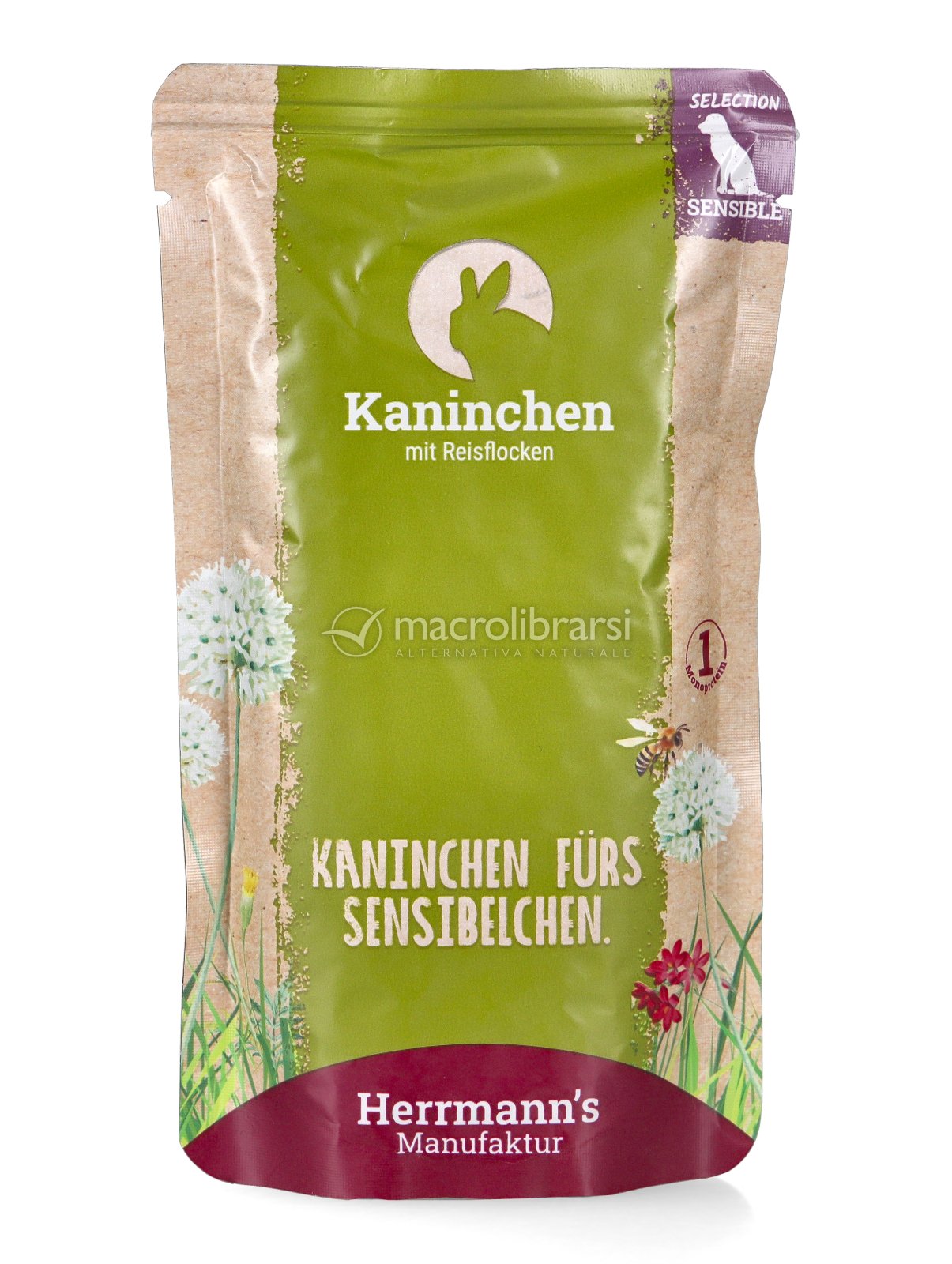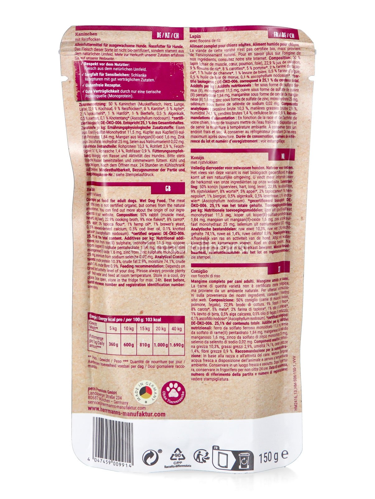 Herrmann’s Selection al Coniglio con fiocchi di Riso è un alimento umido completo, realizzato con ingredienti di qualità alimentare umana provenienti da agricoltura biologica certificata.