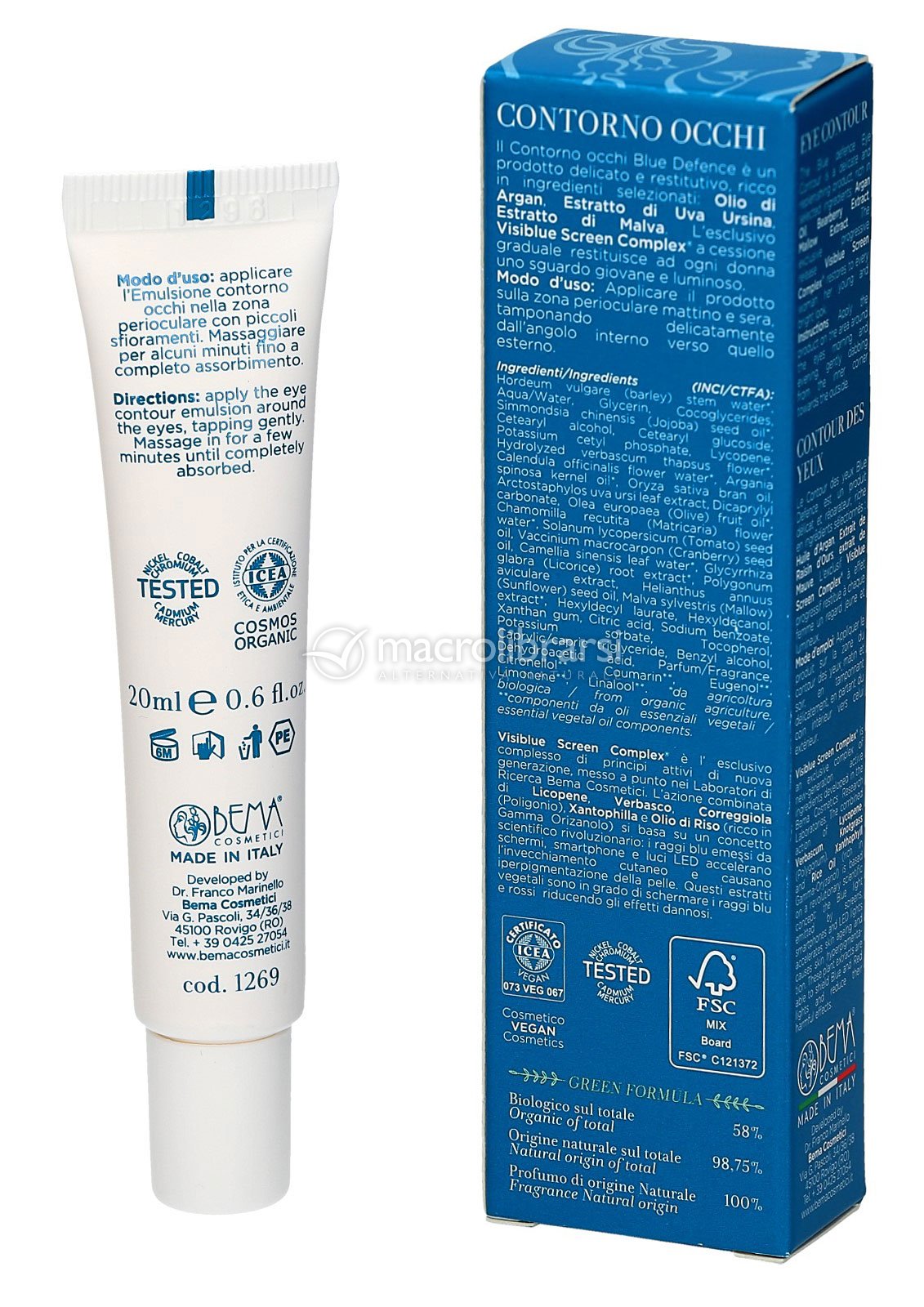 L'emulsione Contorno occhi Blue Defence è un prodotto delicato e restitutivo, ricco di ingredienti selezionati: Olio di Argan, Estratto di Uva Ursina, Estratto di Malva. L’esclusivo Visiblue Screen Complex® a cessione graduale restituisce ad ogni donna uno sguardo giovane e luminoso.
