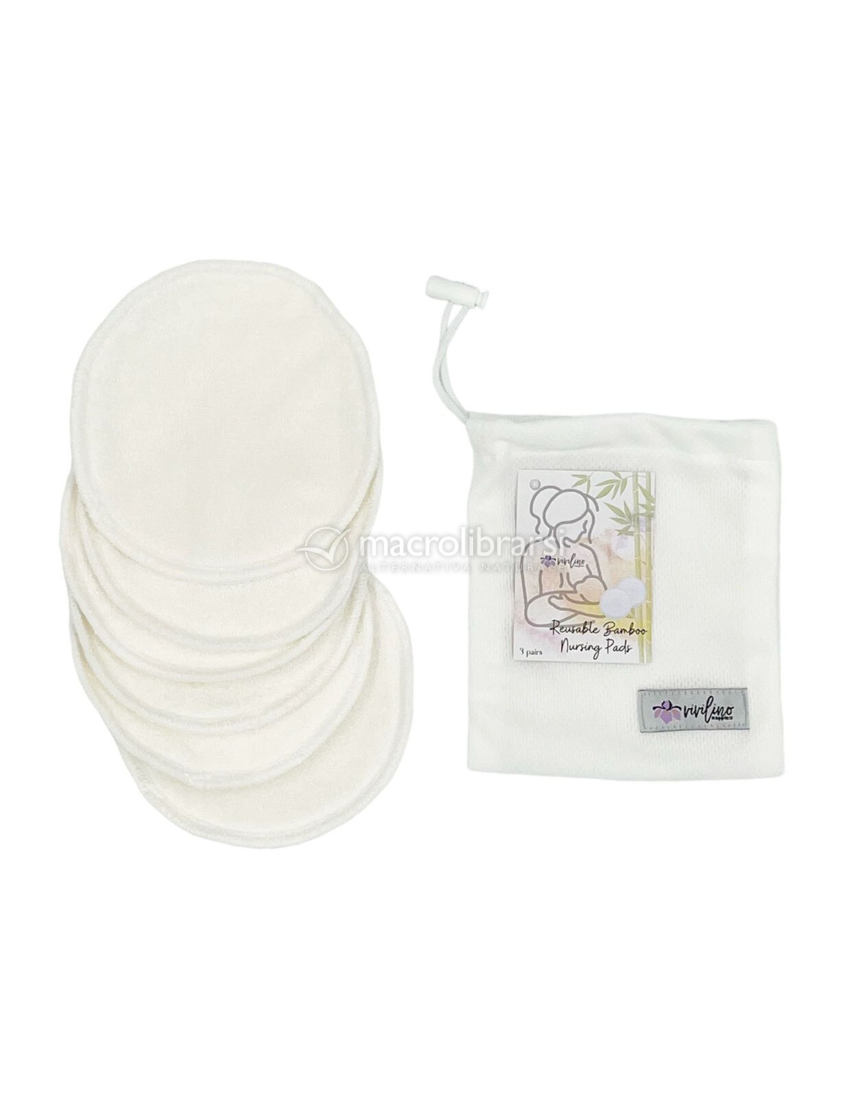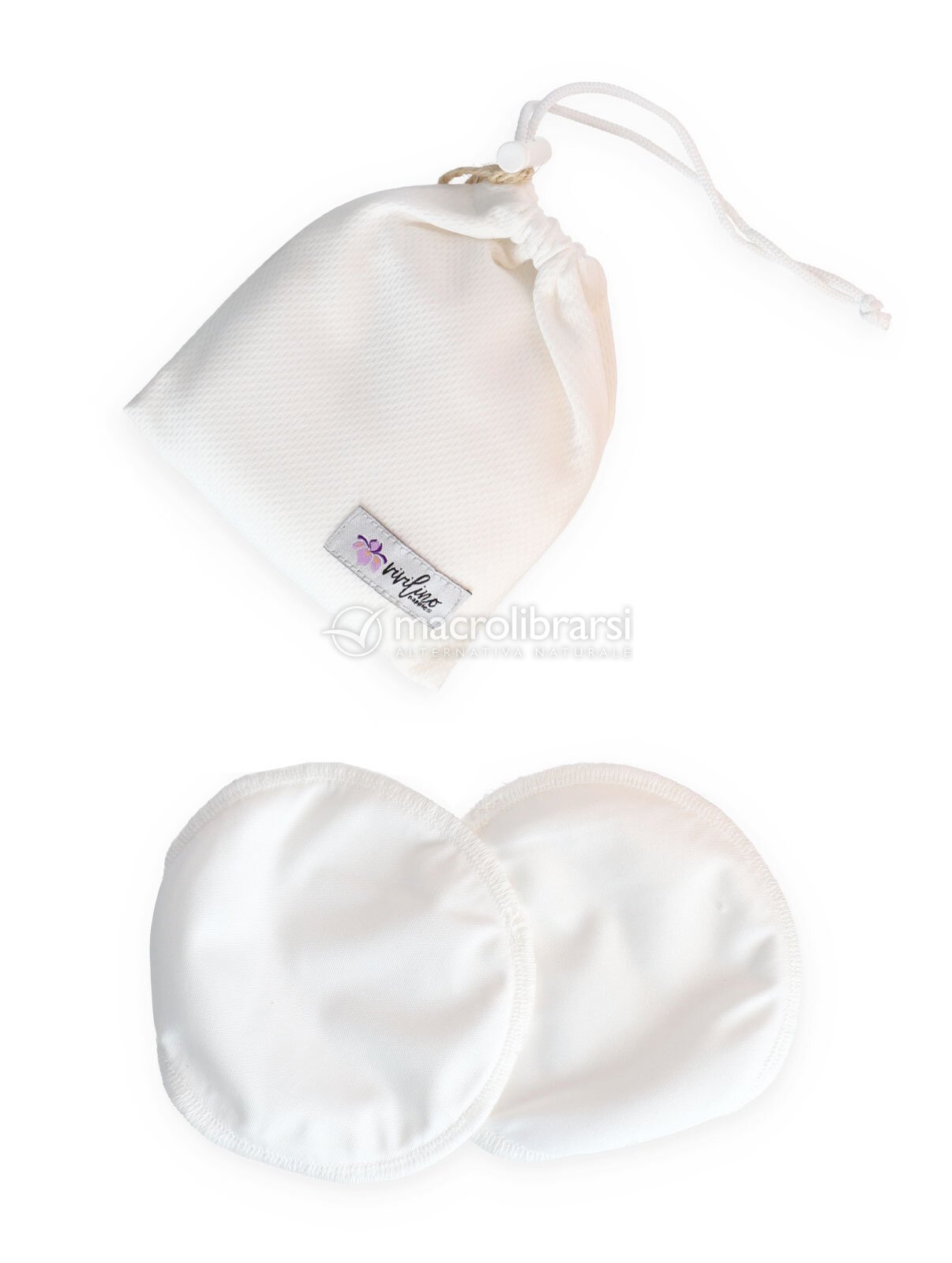 Set di 3 paia di coppette assorbilatte in morbido bambù certificato, lavabili e riutilizzabili, accompagnate da una praticissima retina con chiusura coulisse per riporle.