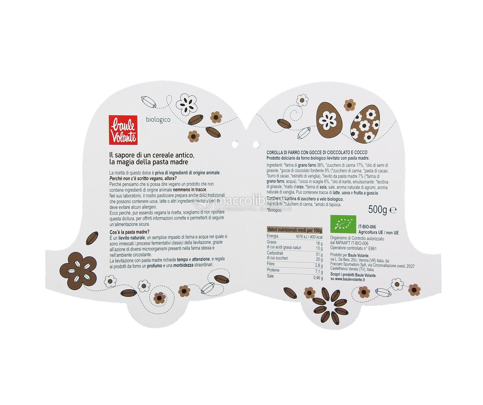 "Corolla di Farro con Cioccolato e Cocco per trasformare la tua pasqua in un giorno speciale!". Cito la frase di apertura usata da Macrolibrarsi nel descrivere questo dolce che, per me, è buono sempre! Che sia Pasqua, Natale o un giorno qualunque, è una vera coccola per il palato. Realizzato con pasta madre di farro, olio di semi di girasole, cioccolato squisito e di qualità, cocco profumato...la Corolla è leggera, digeribile. Consigliata.